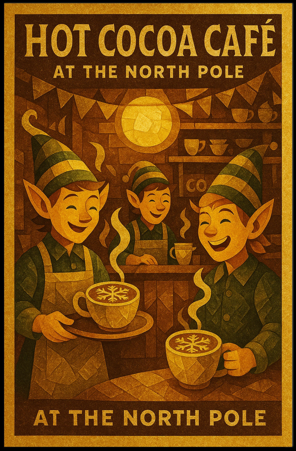 - Printed with precision and made to inspire, this artwork is more than decoration—it’s a conversation piece that connects warmth, imagination, and style. Bring Hot Cocoa Café At The North Pole into your home, classroom, or office today and let your walls tell a cozy story.