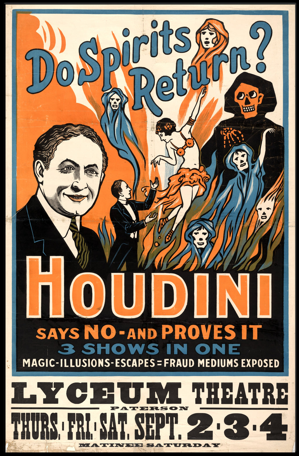 Bring the mystery and drama of classic theatre into your home with the Houdini Magic Illusion Show Vintage Cultural Poster from PosterGoat. This eye-catching 18x24 poster reproduces a bold, turn-of-the-century showbill featuring Houdini's portrait, stylized spirits, flames and a striking orange-and-blue palette—perfect for collectors, theatrical decor, and fans of magic art.