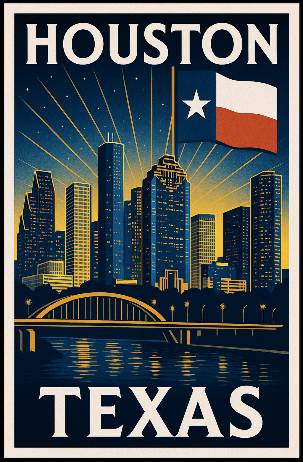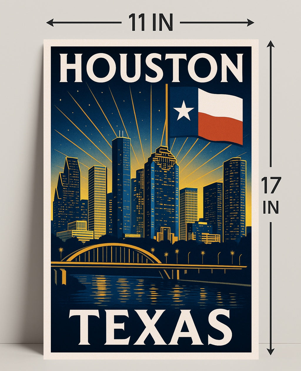 Houston, Texas Skyline Poster — Bring the bold spirit of Houston into your home with this striking vintage-inspired poster from PosterGoat. Rendered in deep navy and warm gold tones, the print features a silhouetted skyline, radiant sunburst lines, a waving Texas flag and a graceful arched bridge mirrored in shimmering water for a timeless, minimalist look.