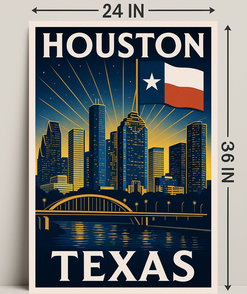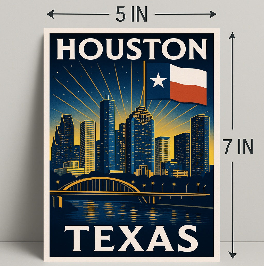 - Iconic design: Retro travel-poster composition highlights Houston’s skyline with crisp architectural silhouettes and elegant type treatment.