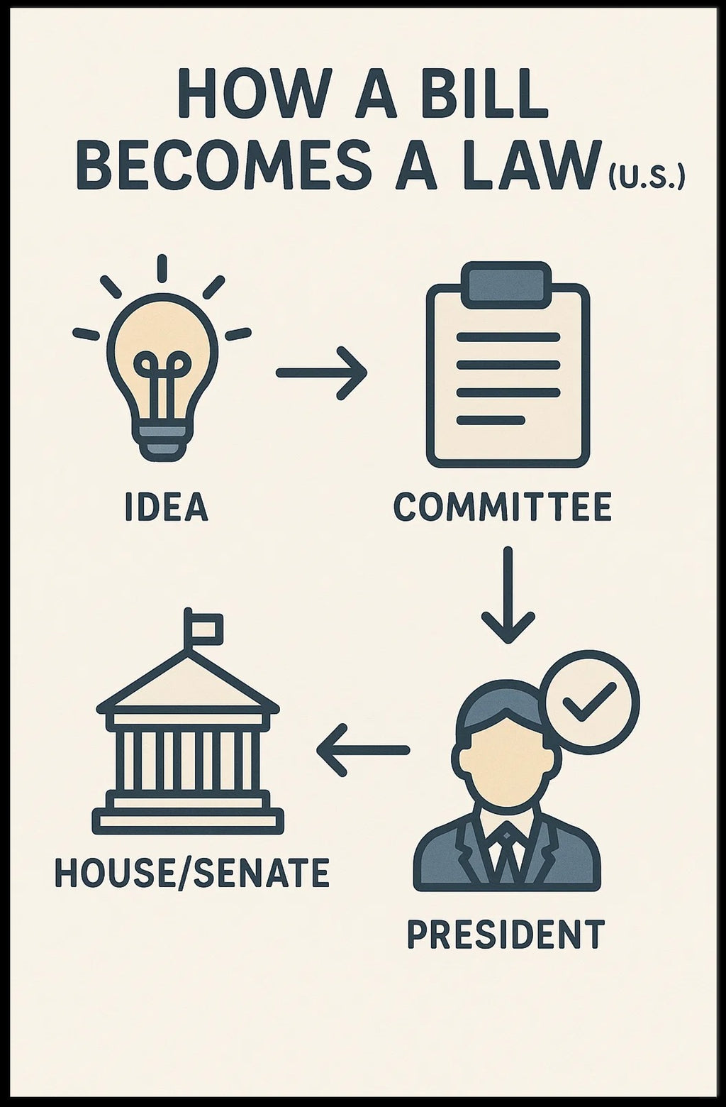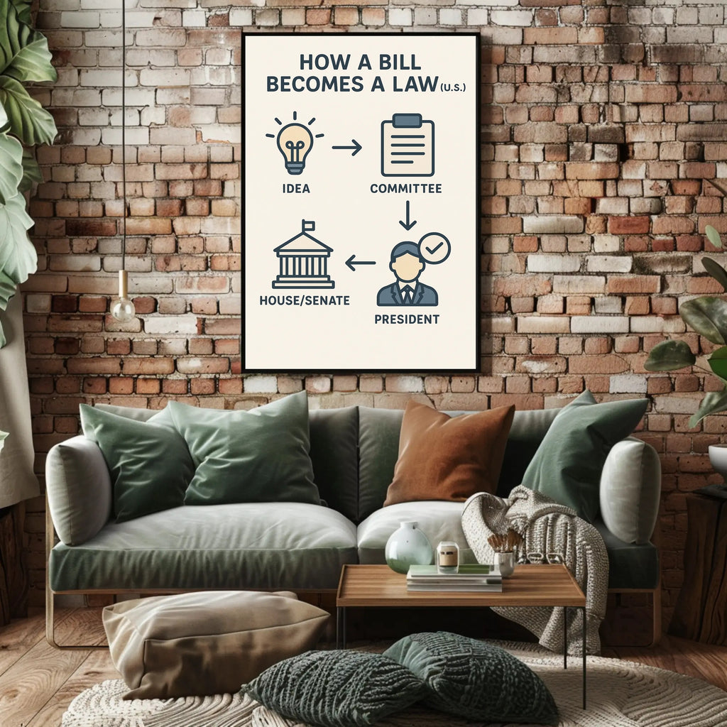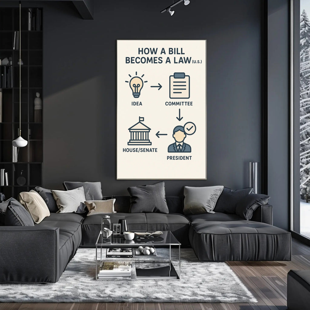 This poster provides a clear visual journey of how a bill transforms into law within the United States legislative system. Featuring an informative infographic design, it includes symbolic representations: a light bulb for ideas, a document for committee review, a government building for congressional proceedings, and a presidential figure with a checkmark for final approval. The clean and simple illustrations ensure easy understanding, making it an ideal educational tool for classrooms or offices. Perfect for anyone interested in civics or government processes, this poster combines educational value with a visually striking presentation.