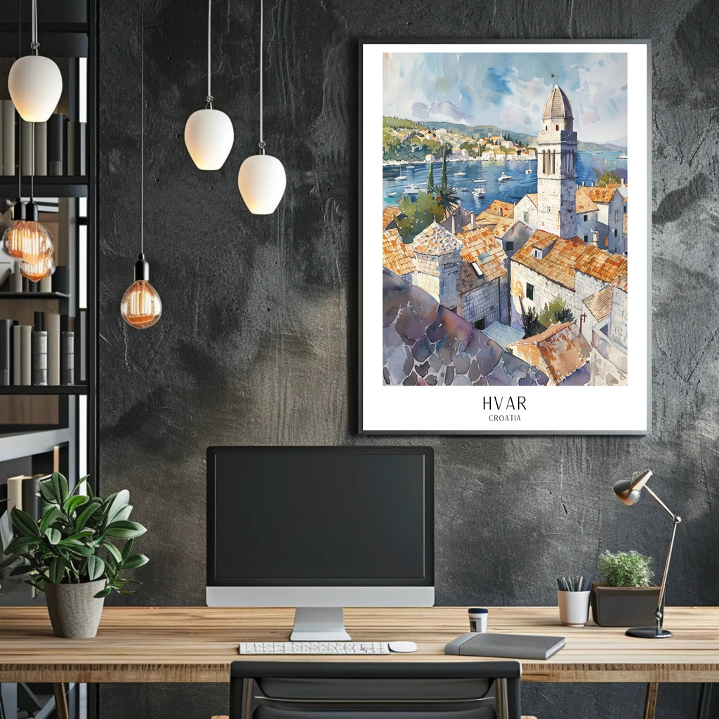 Immerse yourself in the charm of Hvar, Croatia with this captivating watercolor illustration. This poster beautifully captures the essence of this picturesque coastal town, with its charming stone buildings adorned with warm terracotta roofs, a prominent stone tower, and lush greenery surrounding a tranquil harbor filled with sailboats and yachts. The serene background showcases rolling hills and the deep blue sea, creating a peaceful and idyllic scene. The soft blends and fluid lines of the watercolor style evoke a timeless artistic feel, making it a perfect addition for those inspired by travel and cultural beauty.