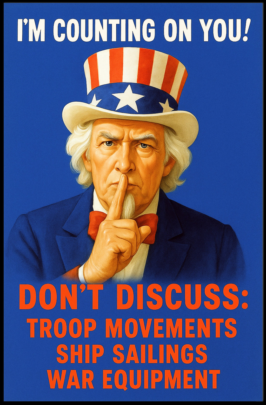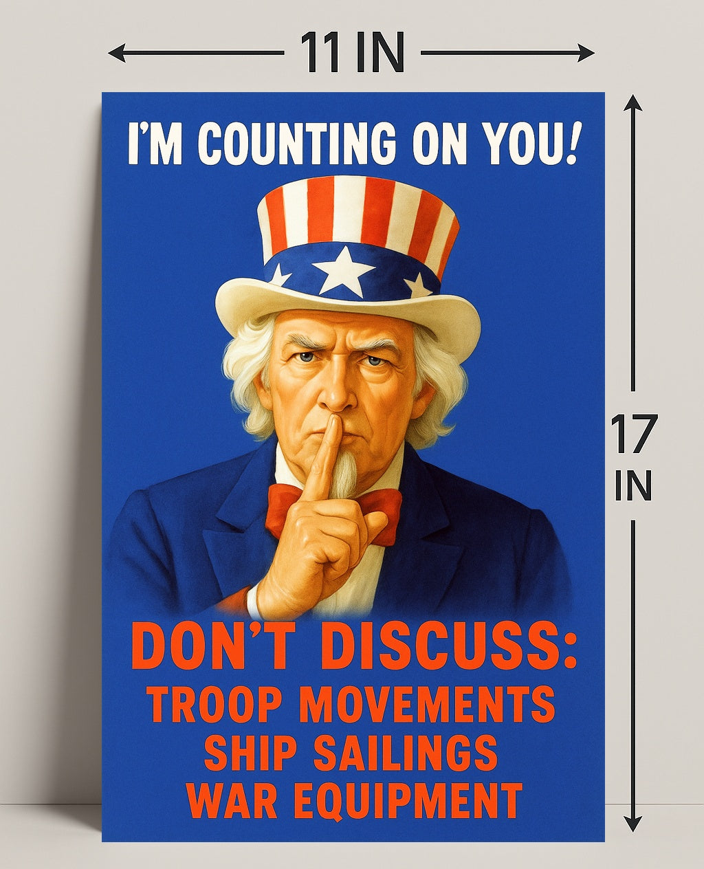 I'm Counting on You! Poster from PosterGoat — a bold, minimalist statement poster that blends vintage Americana with modern decor. Featuring a striking portrait of a stern Uncle Sam silhouette against a vivid royal-blue field, this motivational wall art uses high-contrast red and white typography to deliver an unforgettable message that commands attention in any room.