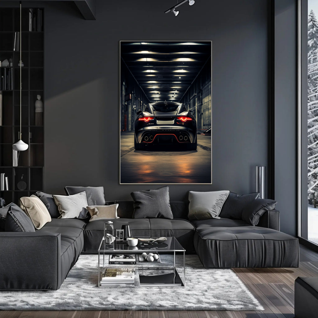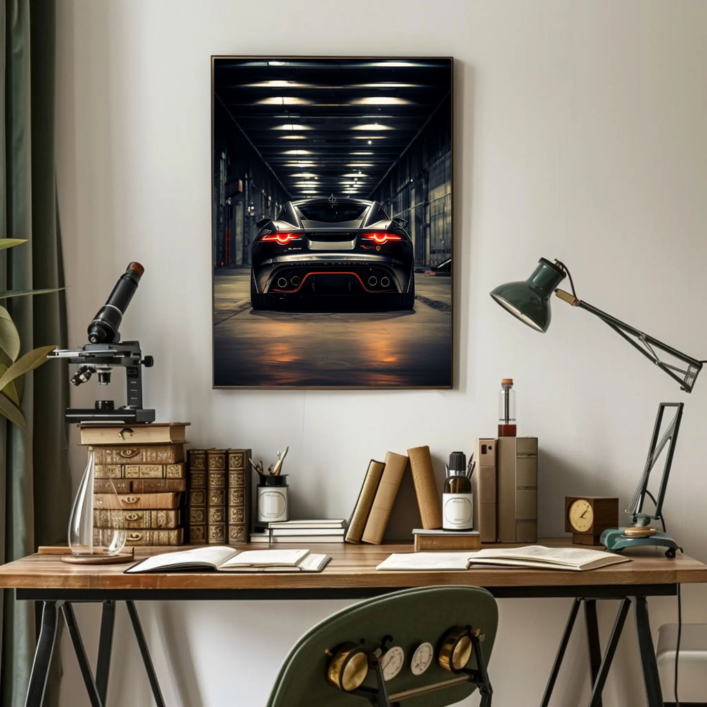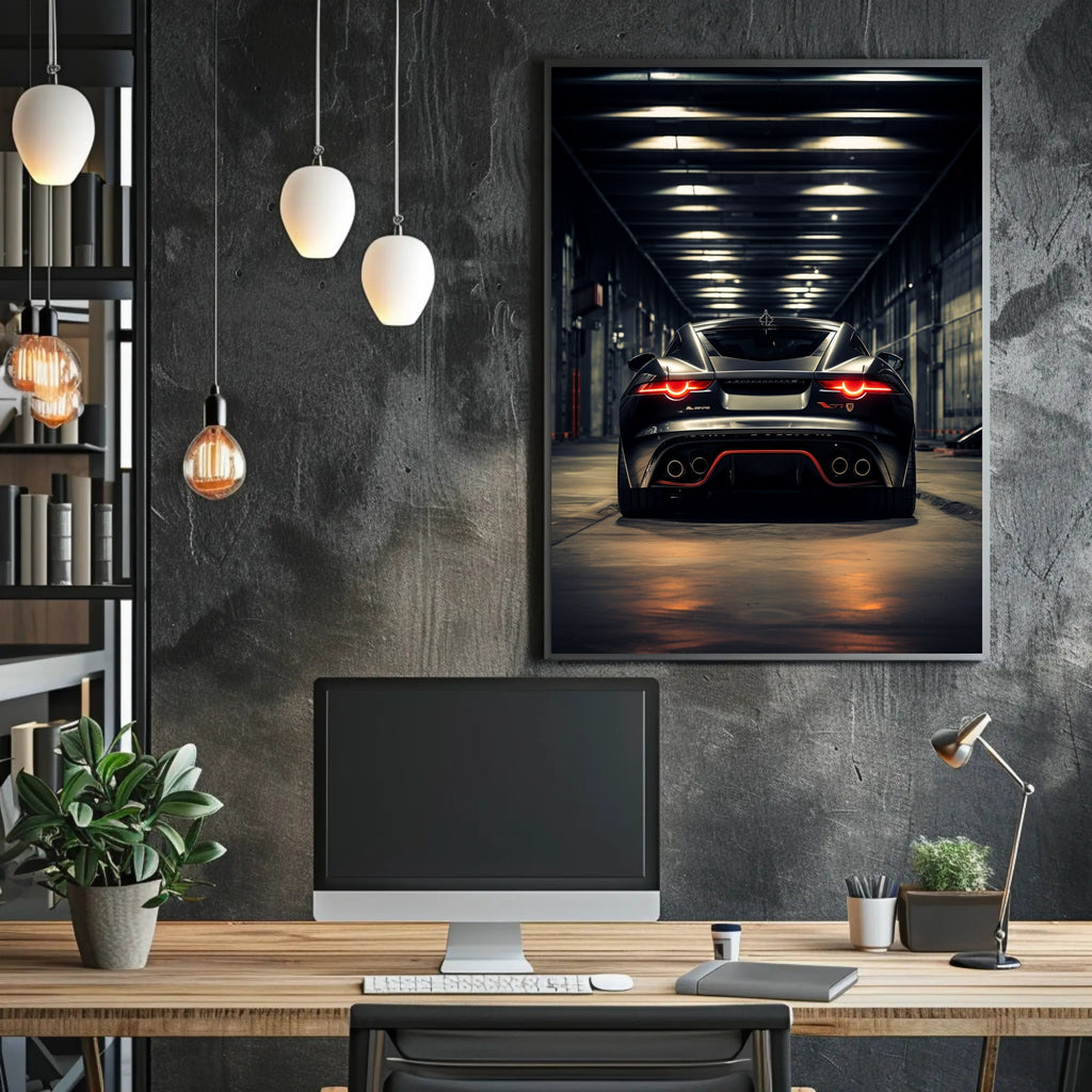 Bring garage-born attitude and cinematic style to your walls with this PosterGoat art print — a striking rear-view of a high-performance sports car parked under moody industrial lights. Rich contrast, sharp detail and glowing red tail-lights create a dramatic focal point that transforms any room into a modern automotive gallery.