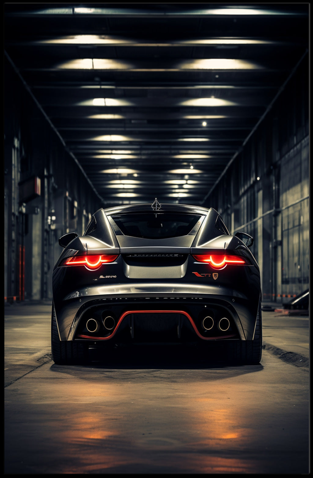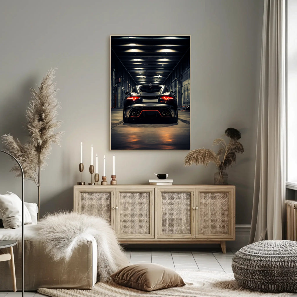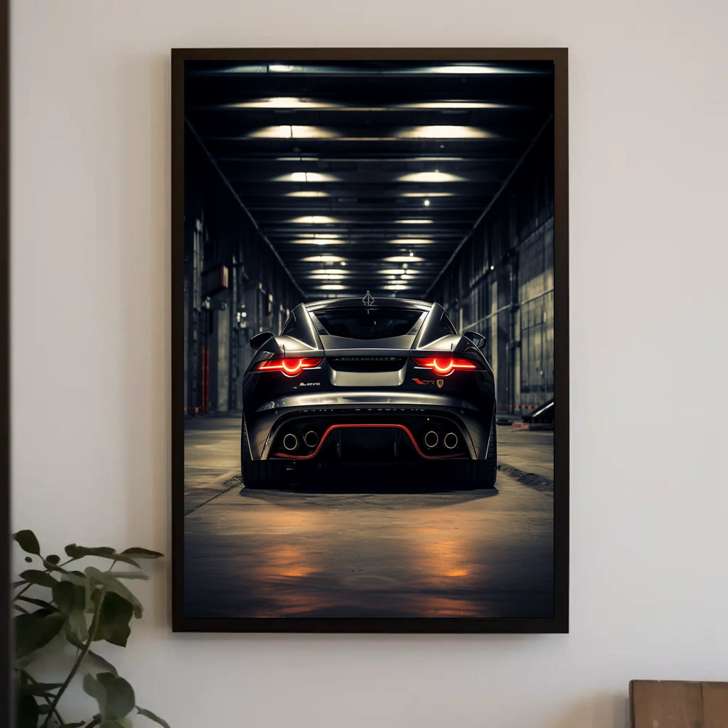 Bring garage-born attitude and cinematic style to your walls with this PosterGoat art print — a striking rear-view of a high-performance sports car parked under moody industrial lights. Rich contrast, sharp detail and glowing red tail-lights create a dramatic focal point that transforms any room into a modern automotive gallery.