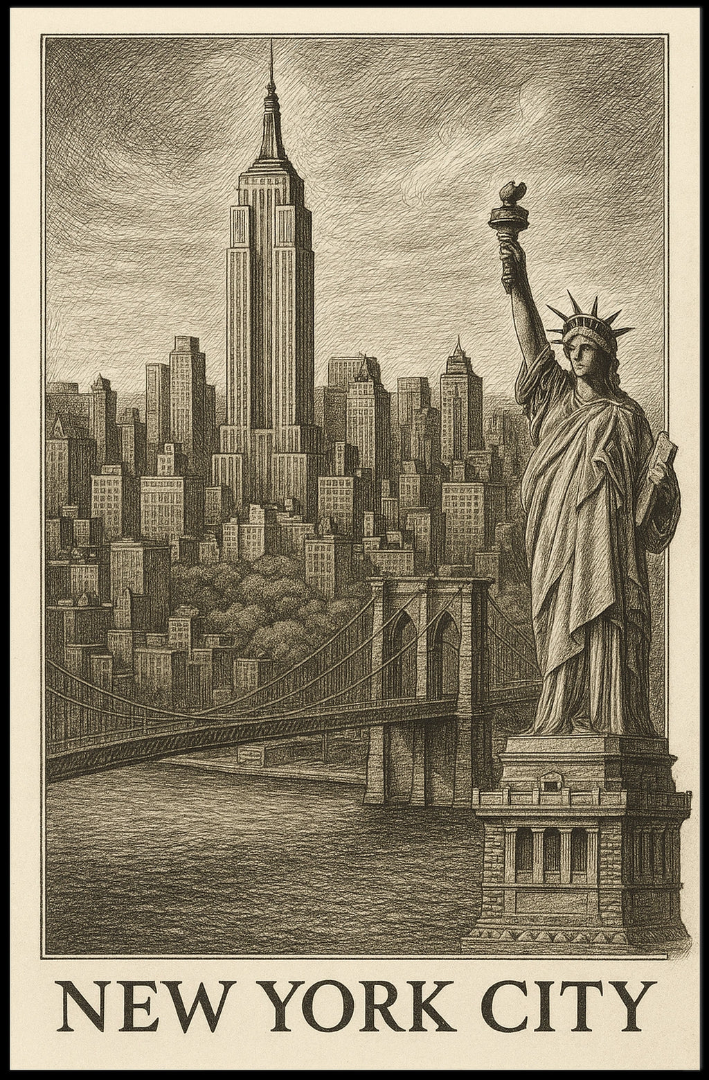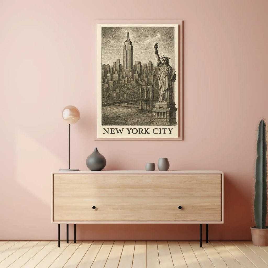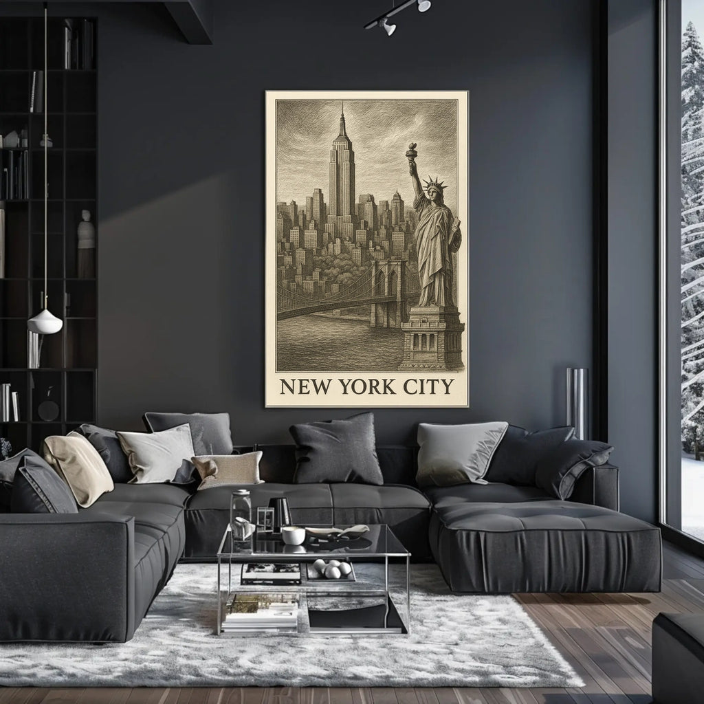 Immerse yourself in the vibrant spirit of the Big Apple with this stunning poster that highlights New York City's most famous landmarks. Featuring the Statue of Liberty, the Empire State Building, and the Brooklyn Bridge, this intricately illustrated print brings the energy of a bustling city skyline into your home or office. Perfect for fans of urban decor and travel-inspired wall art, it adds a bold focal point to any space.
