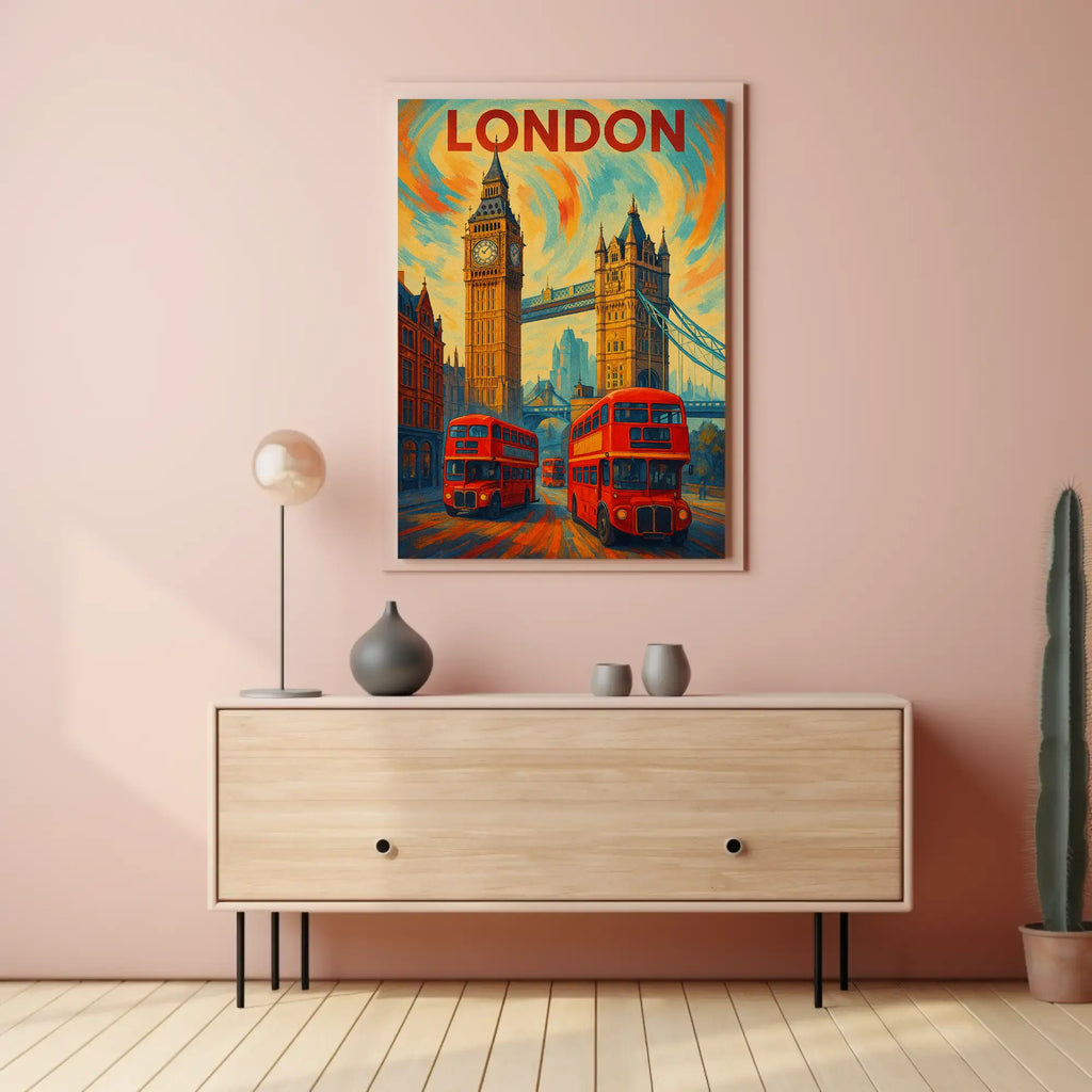 The poster is adorned with the iconic red double-decker buses, emphasizing the unique charm of London's transportation. The swirling sky patterns combined with a warm color palette of reds, oranges, and yellows seamlessly contrast with cool blues, creating a nostalgic yet invigorating ambiance.