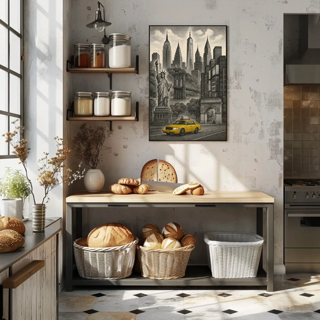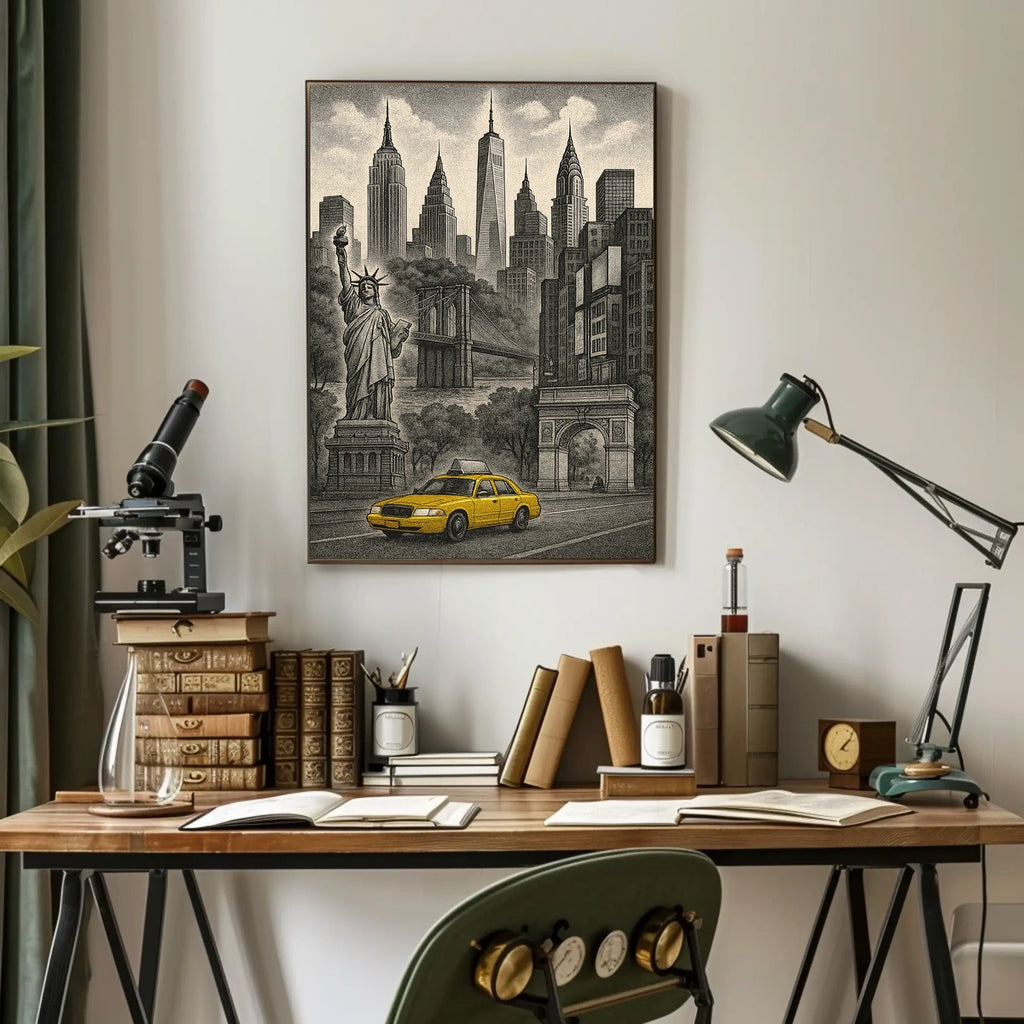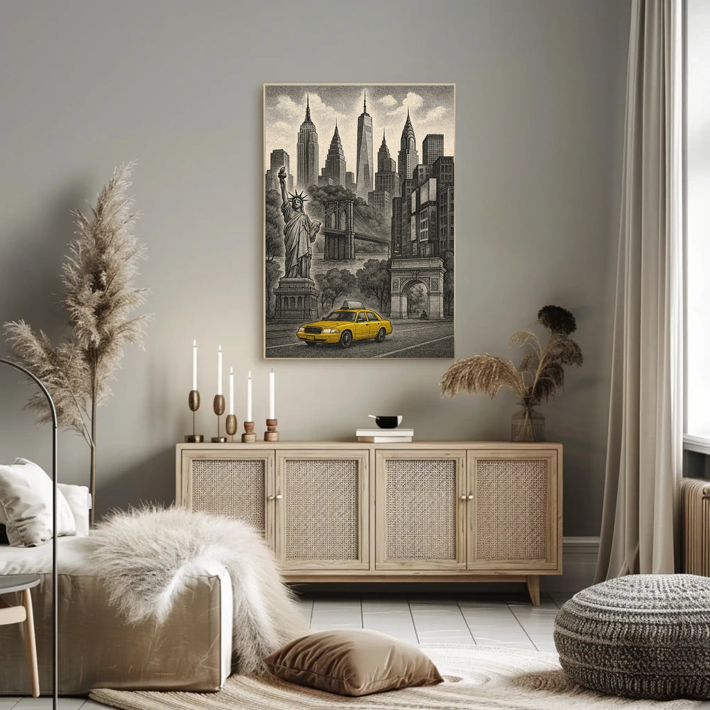 - Iconic landmarks in a single, bold composition — anchors your decor with instantly recognizable symbols of NYC and travel.
