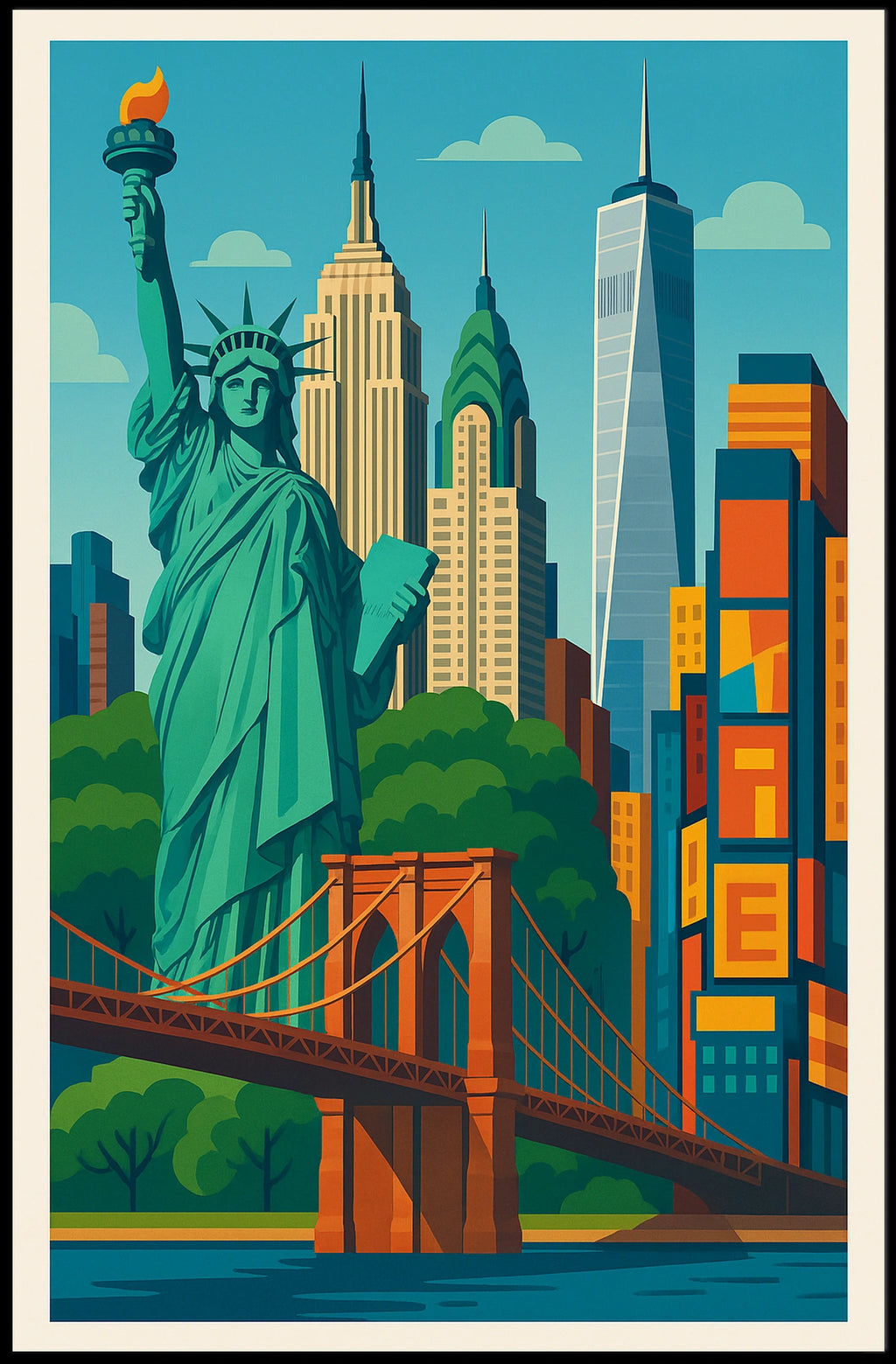 - Iconic landmarks in bold, color-rich detail — this vivid depiction makes Liberty, the bridge, and the skyline stand out, creating instant wall impact.