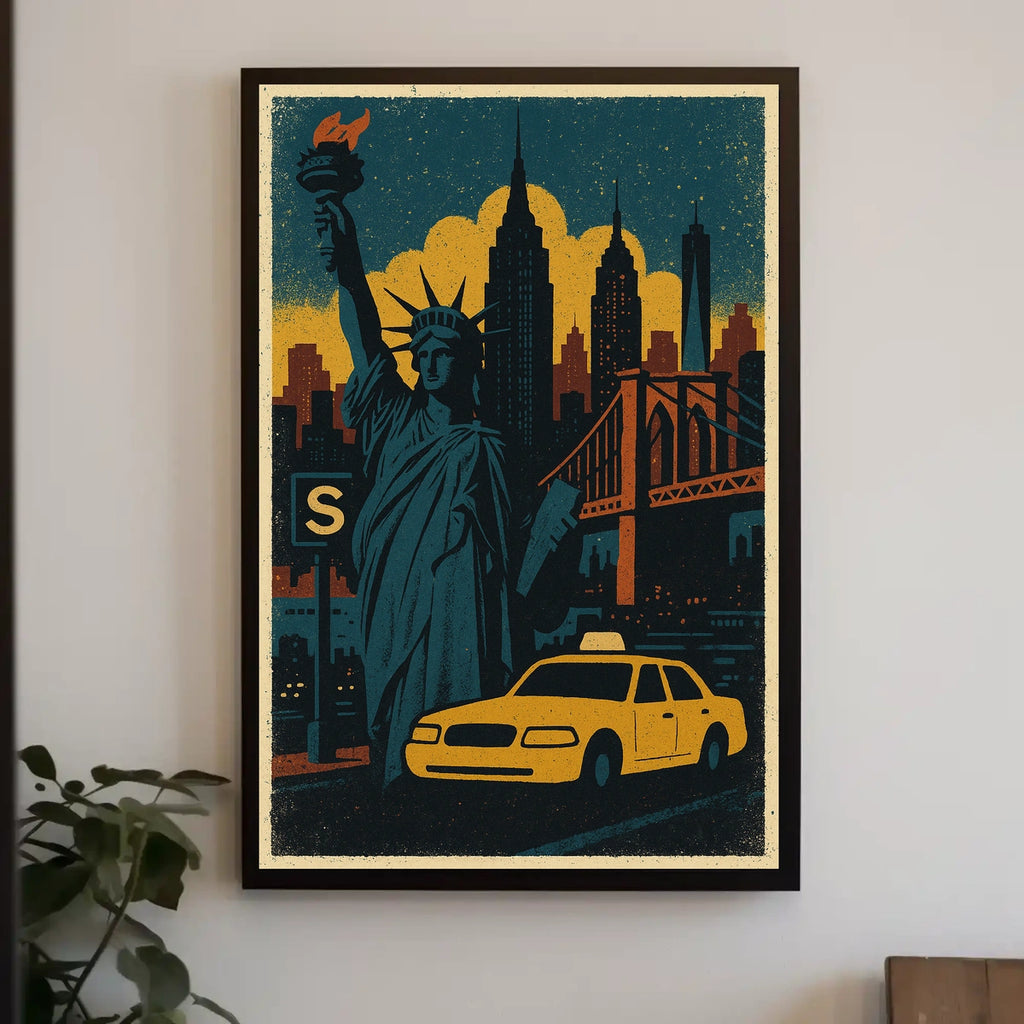 Experience the energy of Manhattan with this vibrant poster, a celebration of iconic NYC landmarks. From the Statue of Liberty to the Brooklyn Bridge and a sweeping skyline, it captures the spirit of the Big Apple in bold, artful detail. Perfect for modern interiors, it invites daily inspiration and a metropolitan vibe.