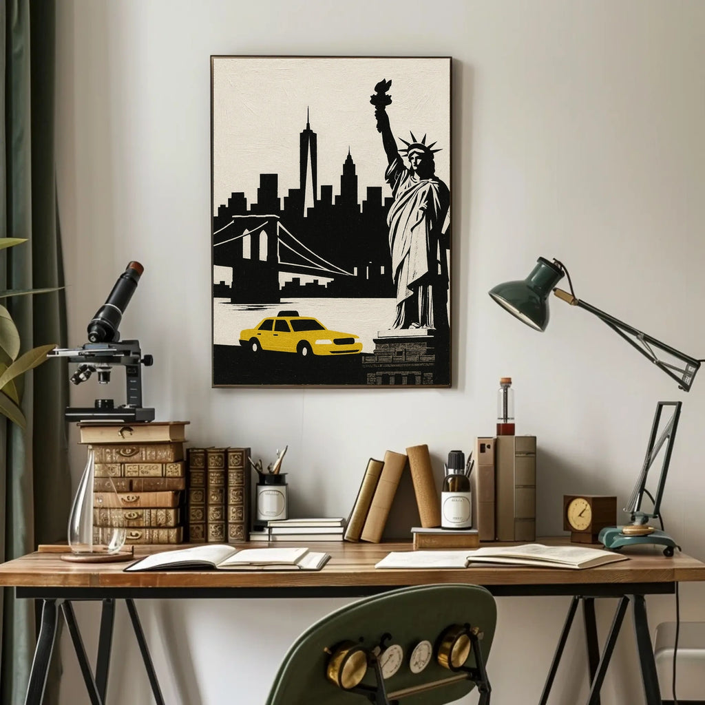 Immerse yourself in the vibrant energy of the Big Apple with this iconic New York City poster. Featuring bold silhouettes of the Statue of Liberty, the Brooklyn Bridge, and a sweeping city skyline, it captures NYC’s heartbeat. The bright yellow taxi adds a playful pop of color and character.