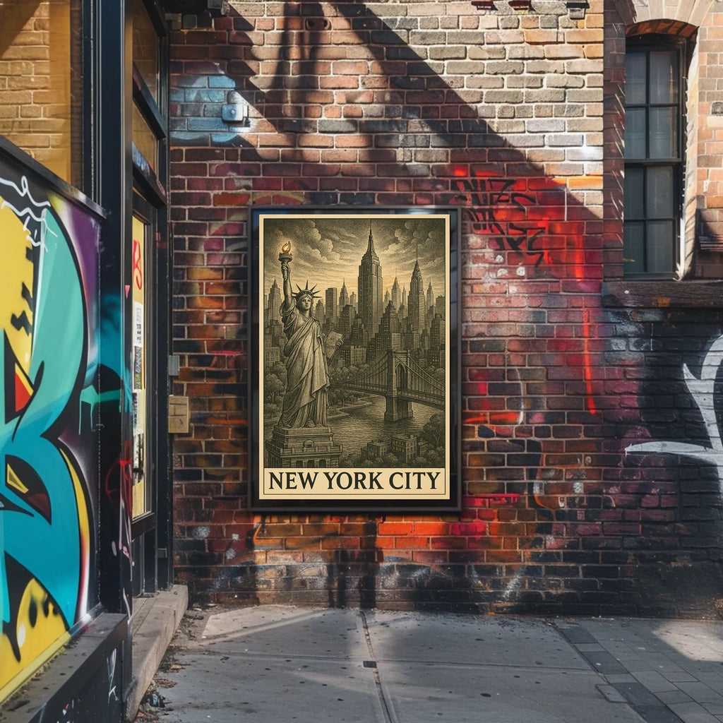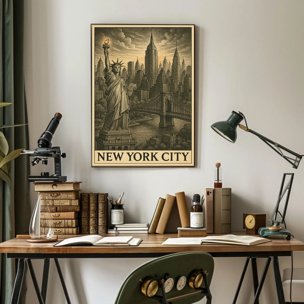 Immerse yourself in the timeless allure of New York City with this vintage-style poster. The meticulous illustration places the Statue of Liberty against a sweeping skyline, delivering classic charm and vibrant city energy to any room.