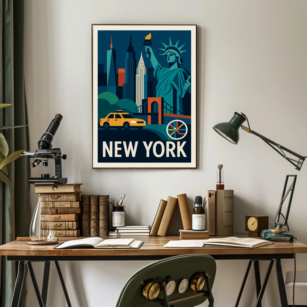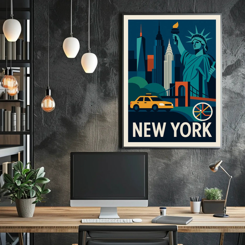 Immerse your space in the electric energy of New York City with this poster. Blending stylized landmarks—Statue of Liberty, Empire State Building, and Brooklyn Bridge—into a bold, geometric composition, it celebrates urban grandeur with a fresh, modern vibe that fits any contemporary decor.