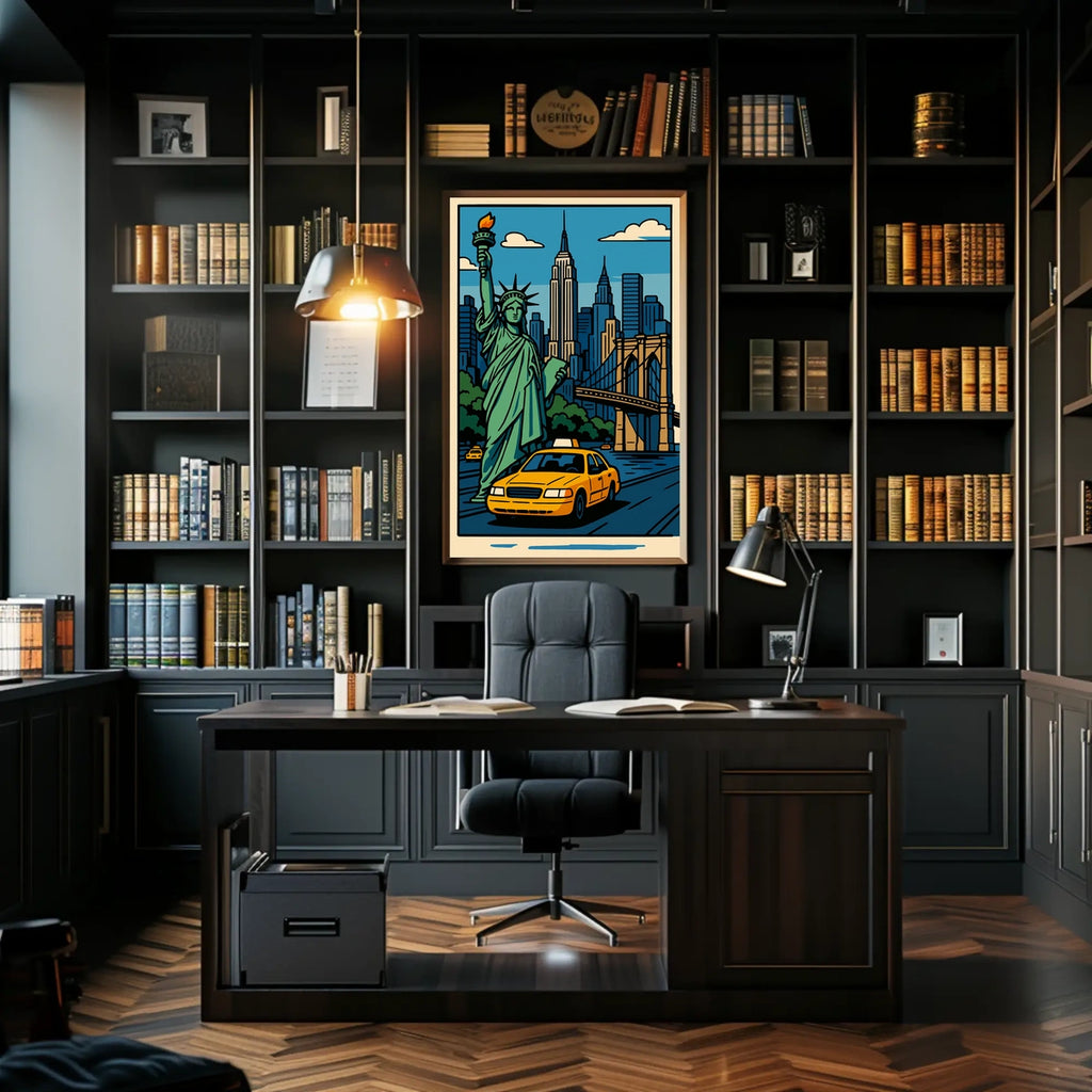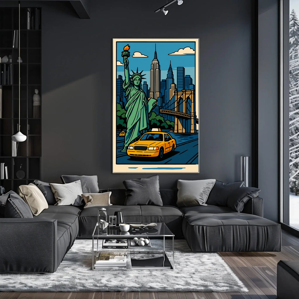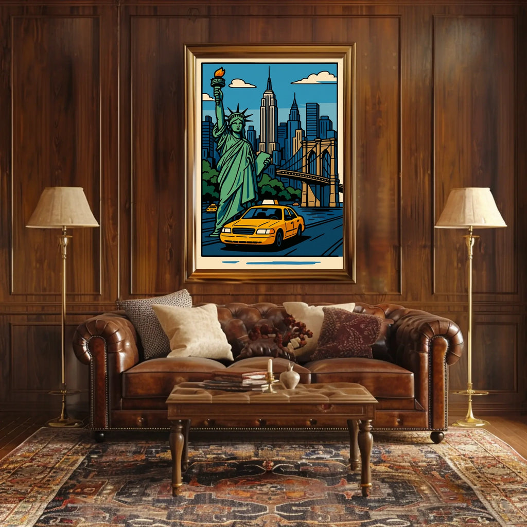 Immerse yourself in the dynamic energy of the Big Apple with this vibrant poster. Featuring the Statue of Liberty, the Empire State Building, and the Brooklyn Bridge, it captures the essence of New York City’s skyline. Perfect for lovers of cityscape art and urban life, it brings iconic landmarks to any space.
