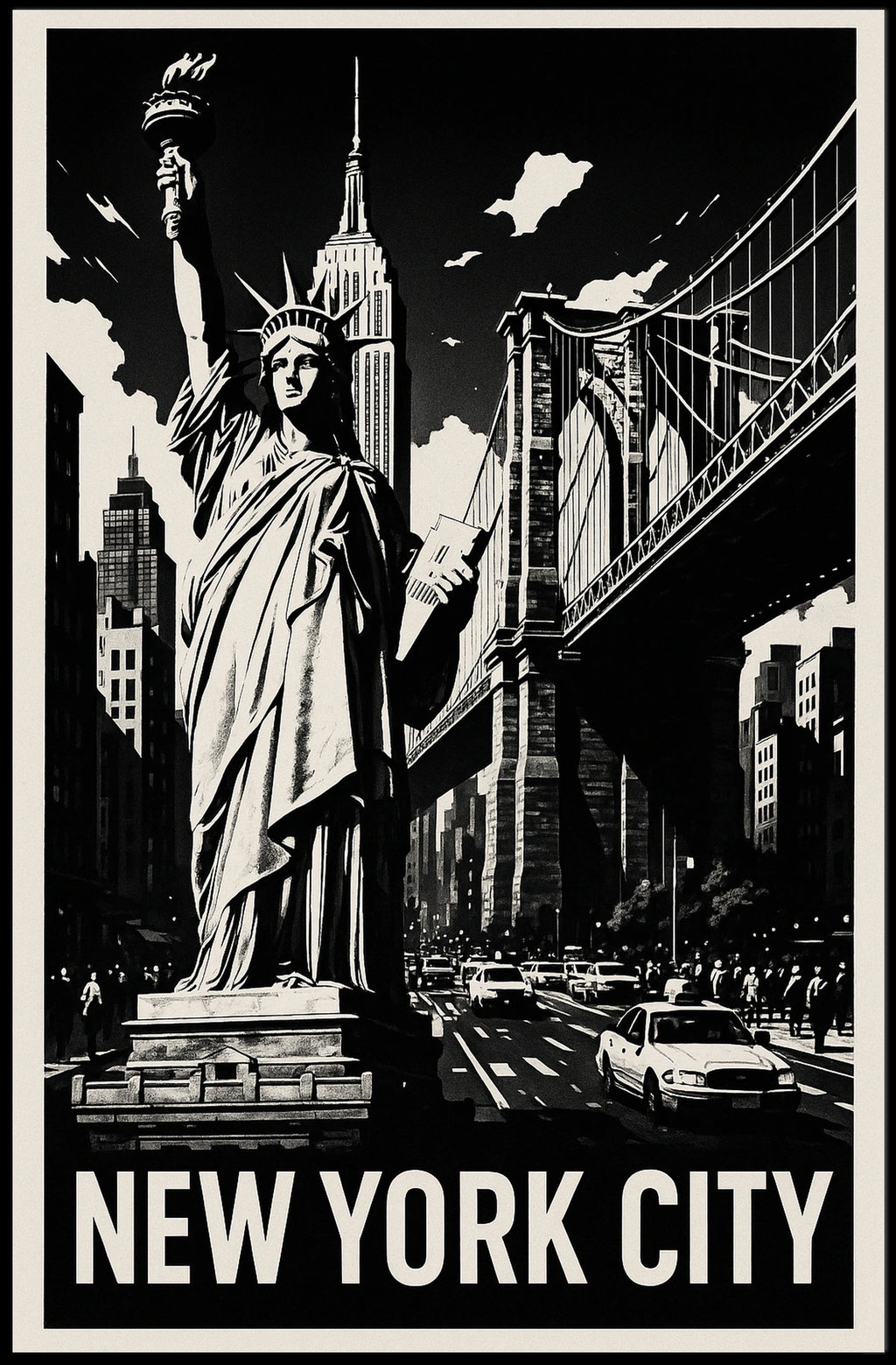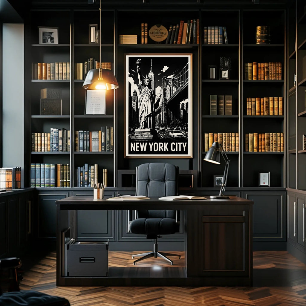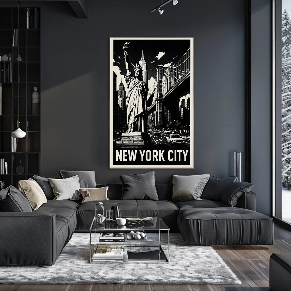 Dive into the heart of the Big Apple with this captivating poster that showcases New York City's iconic landmarks. The monochrome design centers the Statue of Liberty against a dramatic skyline and interconnected bridges, delivering timeless appeal and vibrant urban energy to any space. Perfect for fans of cityscape, architecture, and modern home decor in any space.