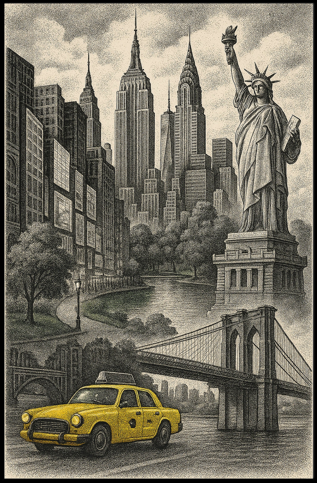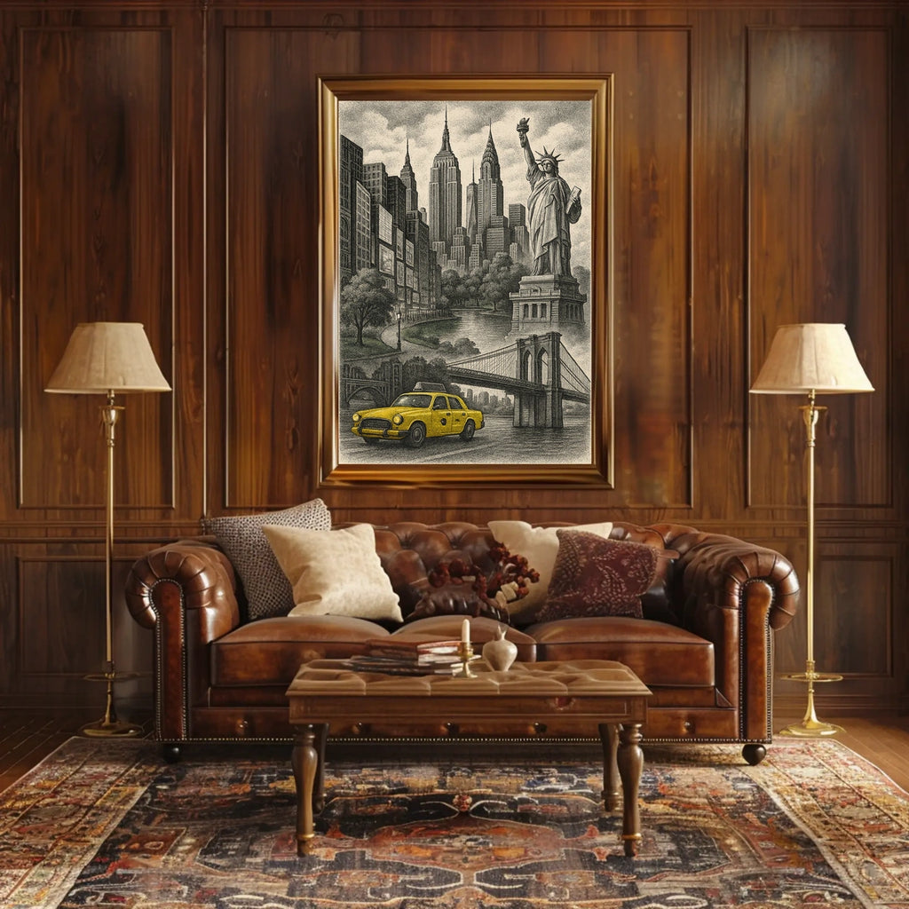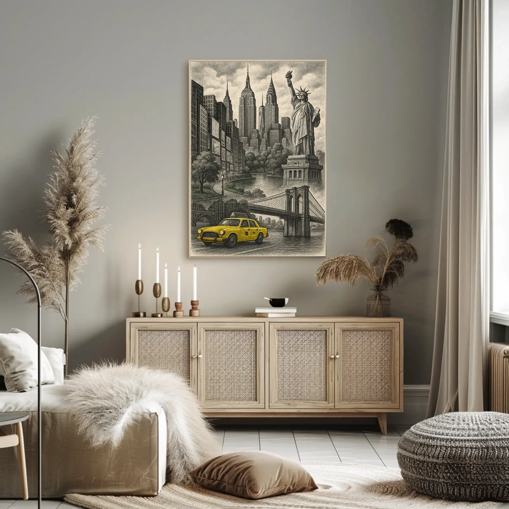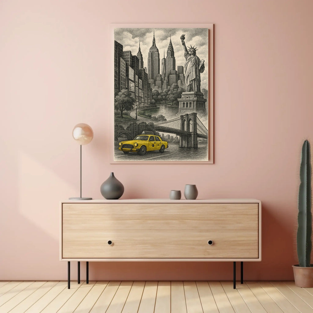 Experience the timeless allure of the Big Apple with this artistic poster that celebrates New York City's iconic landmarks. Rendered in a striking monochrome cityscape, it captures the Statue of Liberty, Empire State Building, and Chrysler Building while a yellow taxi weaves through the streets. This piece brings your walls to life with urban energy and classic NYC charm.