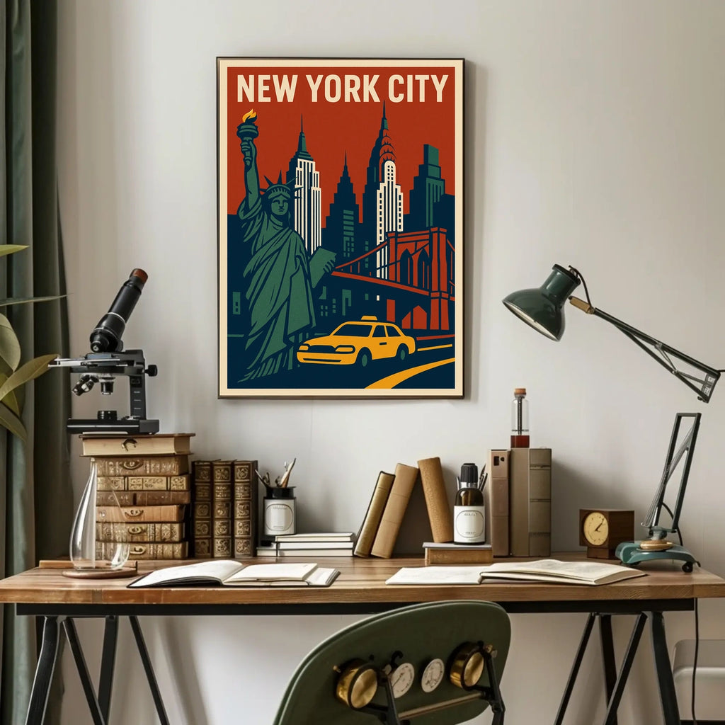Immerse yourself in the vibrant energy of the Big Apple with this Iconic New York City Poster. This striking artwork highlights the Statue of Liberty, a dramatic skyline, and the historic Brooklyn Bridge, capturing NYC’s timeless charm and metropolitan pulse for any space, from living rooms to home offices.