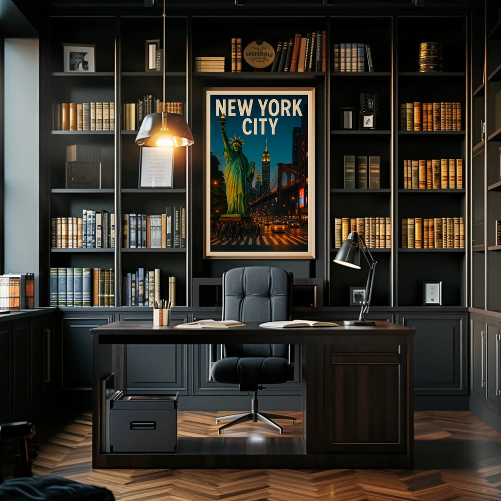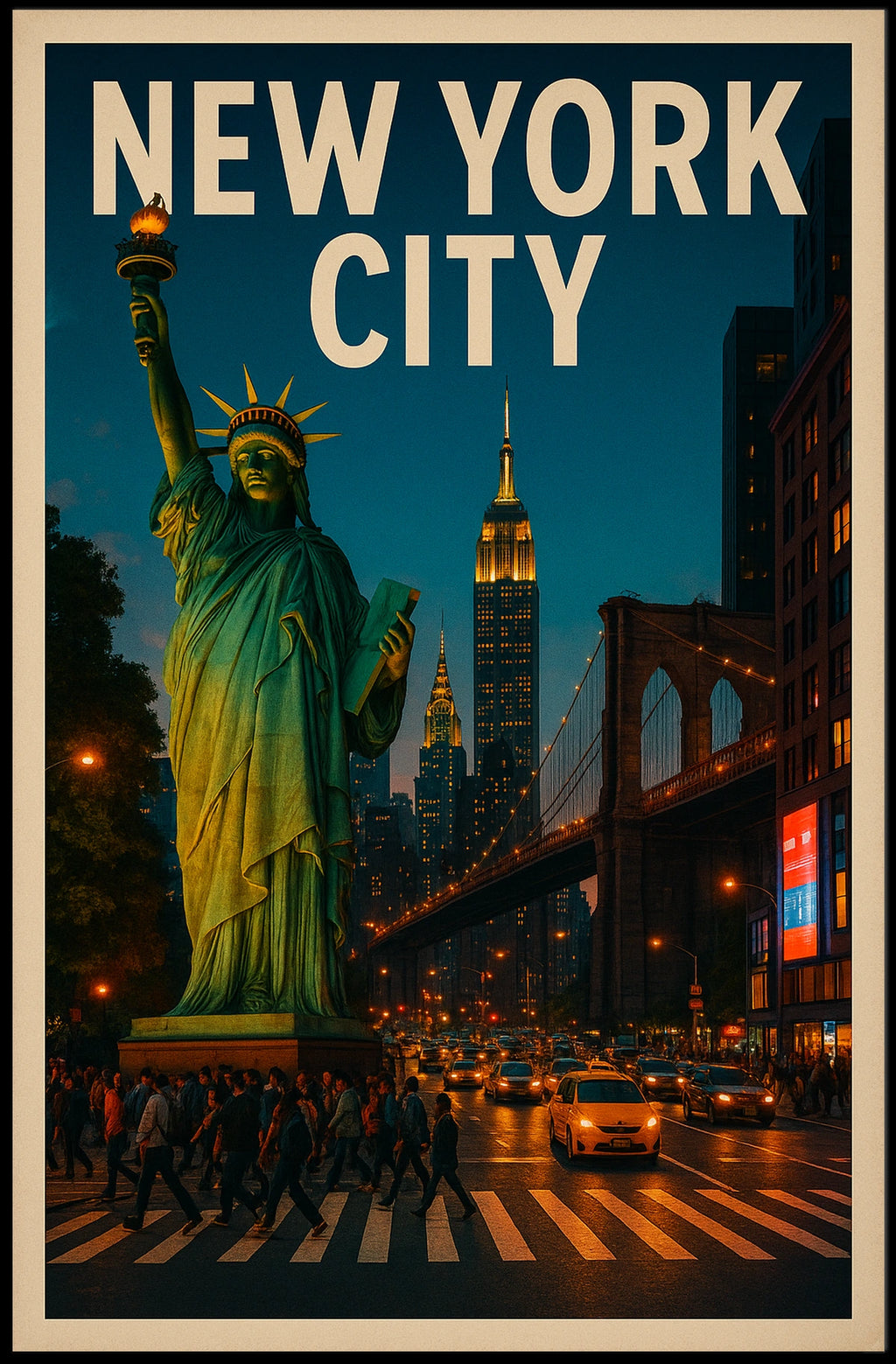 Experience the vibrant energy of New York City through this stunning poster. Featuring the Statue of Liberty, the Empire State Building, and bustling streets, this cityscape captures the essence of the city that never sleeps, making it a perfect centerpiece for living rooms, offices, or bedrooms. A true NYC art piece that adds urban sophistication and travel-inspired charm.