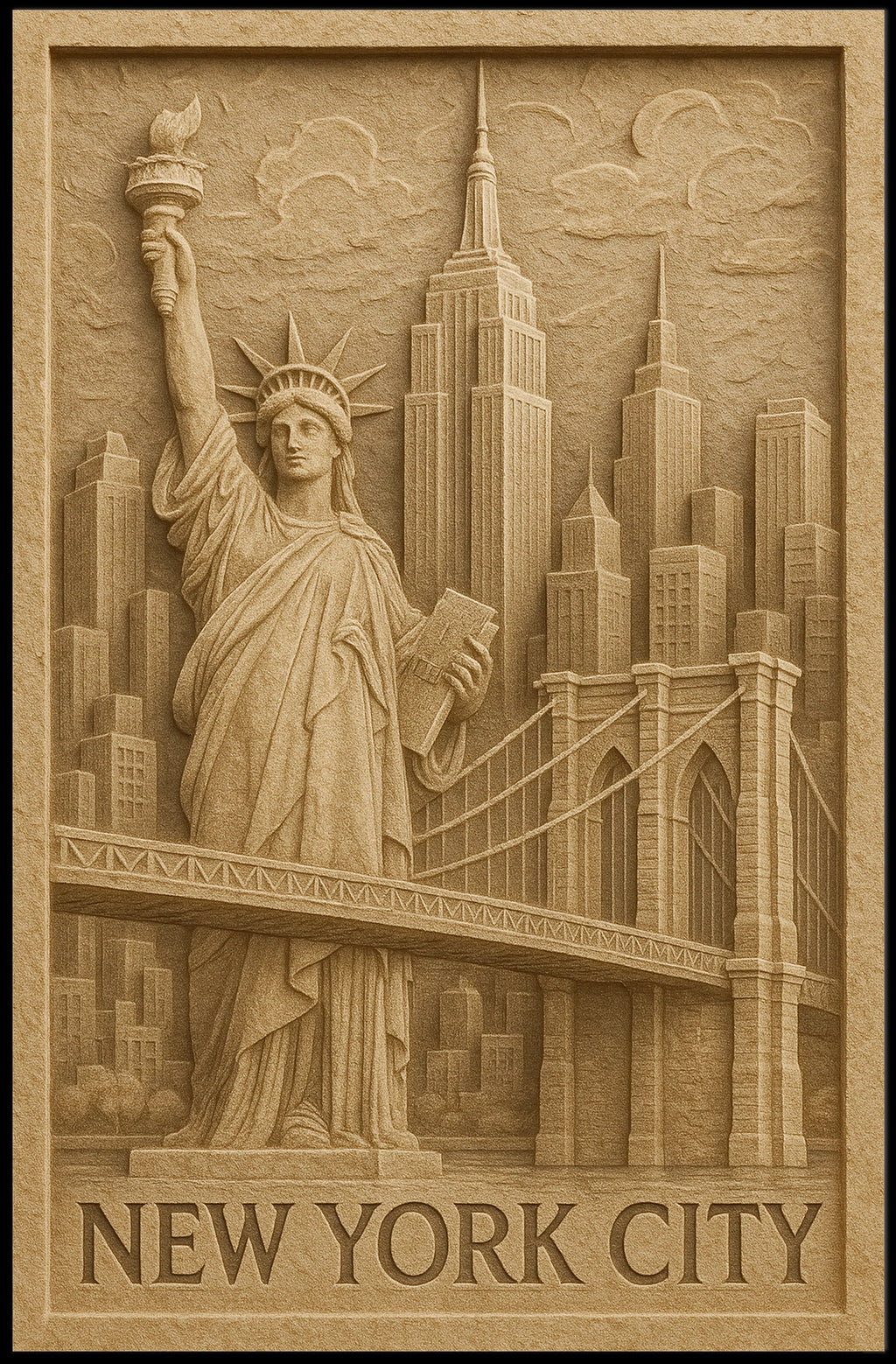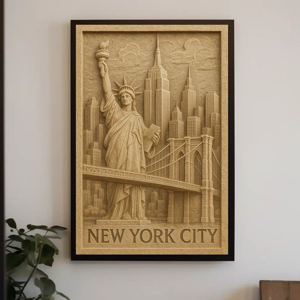 Capture the spirit of the Big Apple with this artistic poster, which blends the Statue of Liberty, the Empire State Building, and the Brooklyn Bridge into a carved, stone-like design. It brings timeless city charm and urban energy to any room.