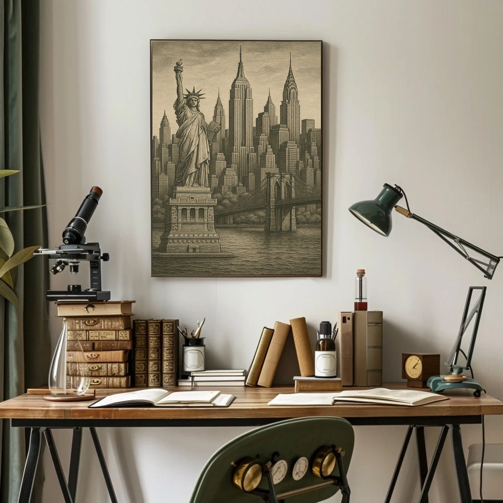 - Iconic landmarks as the focal point — Depicts Statue of Liberty, Empire State Building, and Brooklyn Bridge to create instant recognition and a bold wall centerpiece.