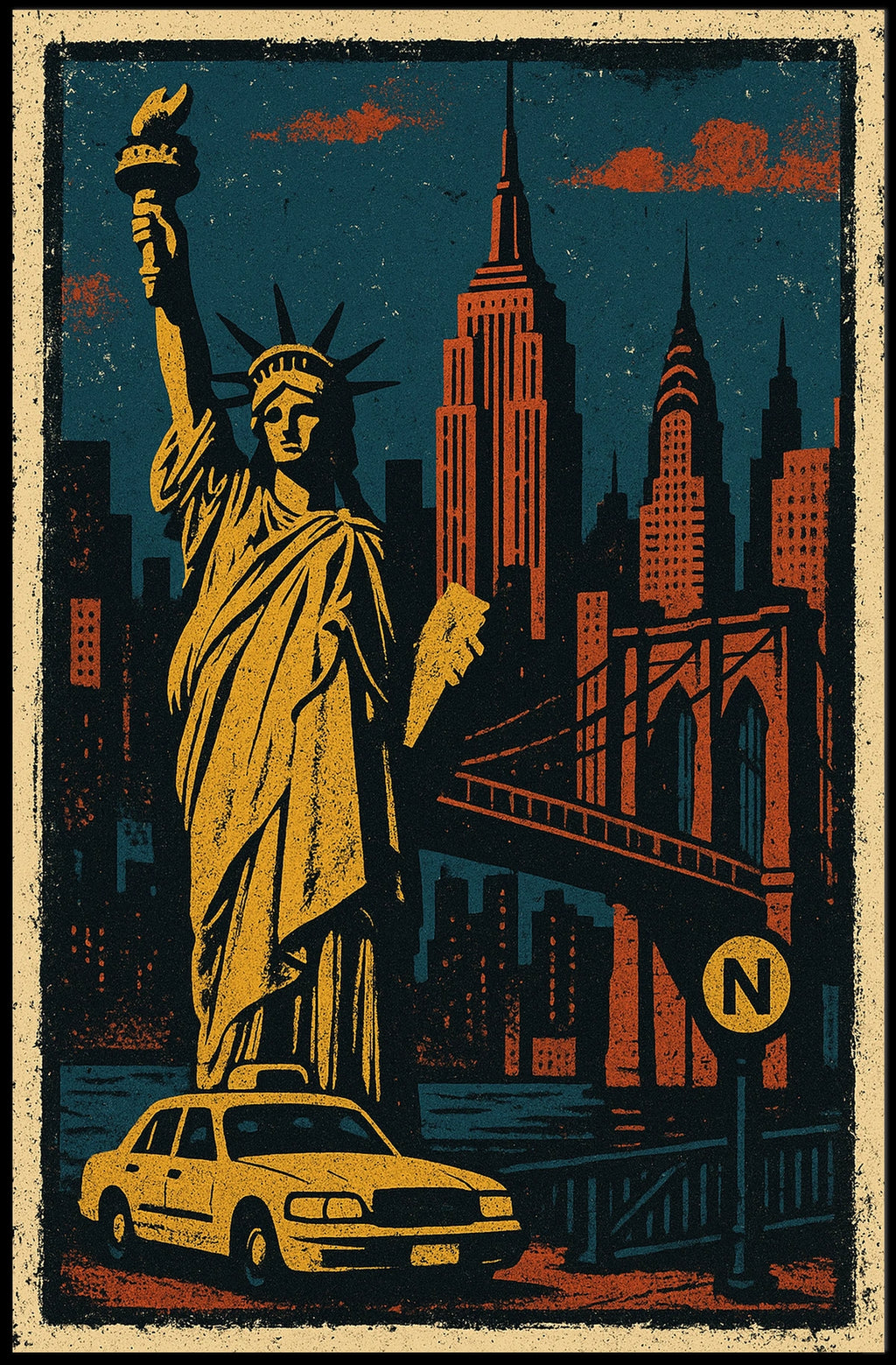 Immerse your space in the timeless allure of New York City with this vintage-style poster. The design spotlights the city’s most iconic landmarks, including the Statue of Liberty, the Empire State Building, and the Brooklyn Bridge, encapsulating the Big Apple’s dynamic spirit for any wall that loves urban charm.