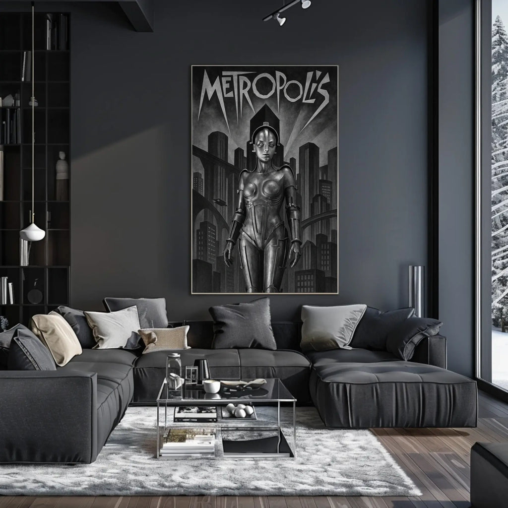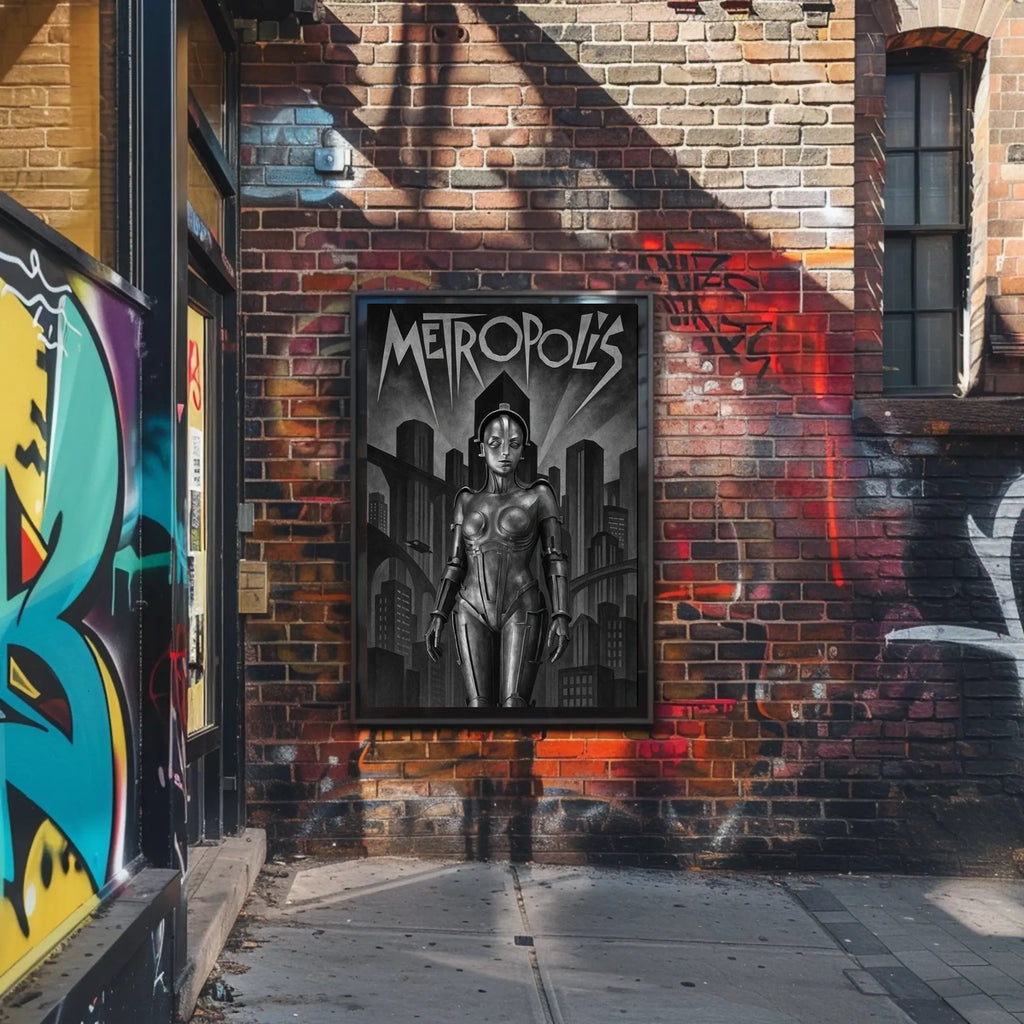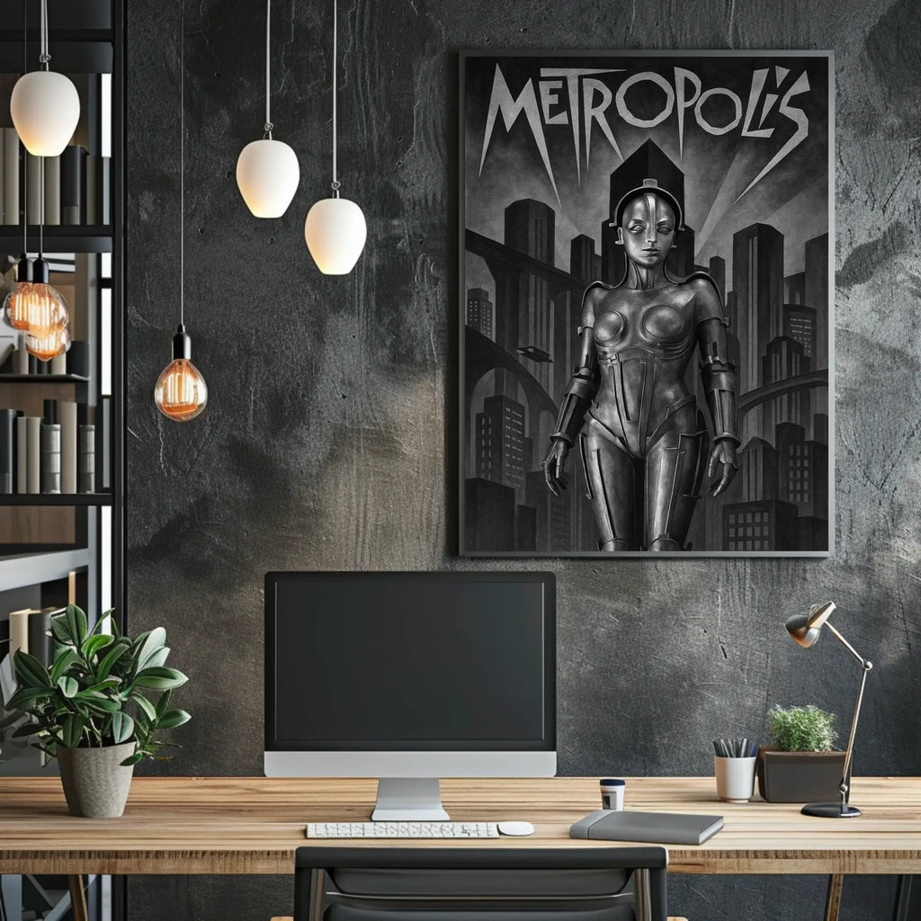 This stunning poster transports you to a captivating science fiction world where classic and futuristic aesthetics meet. At the heart of the design is an iconic robotic figure, rendered in distinctive early 20th-century art deco style. The monochromatic palette enhances its vintage allure, reminiscent of retro film posters. Towering skyscrapers and elevated bridges form an urban, possibly dystopian backdrop, evoking modernism and technological advancement. Bold, angular typography adds drama and intensity to the scene.