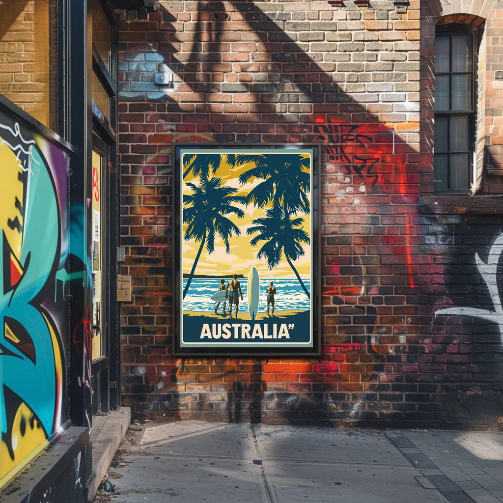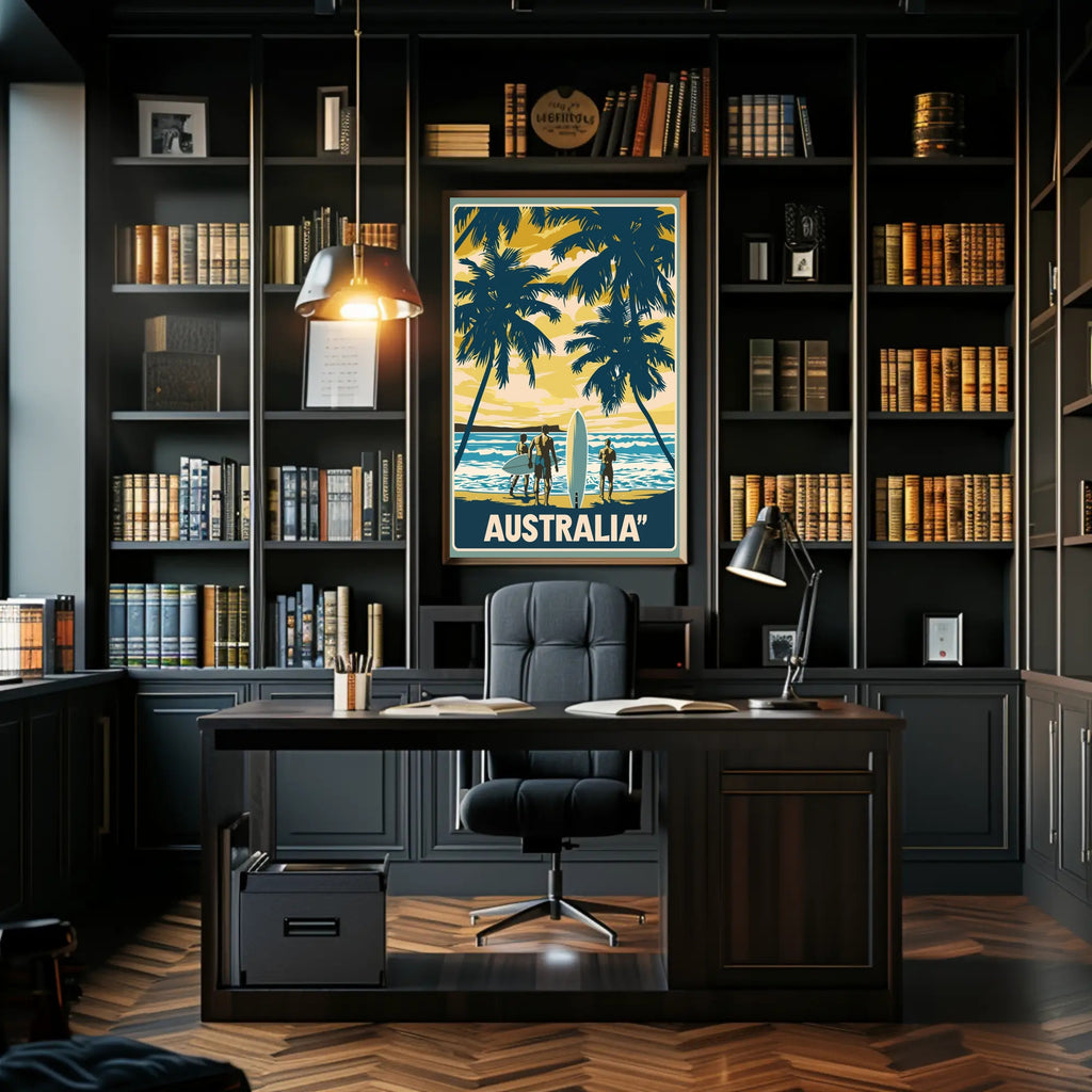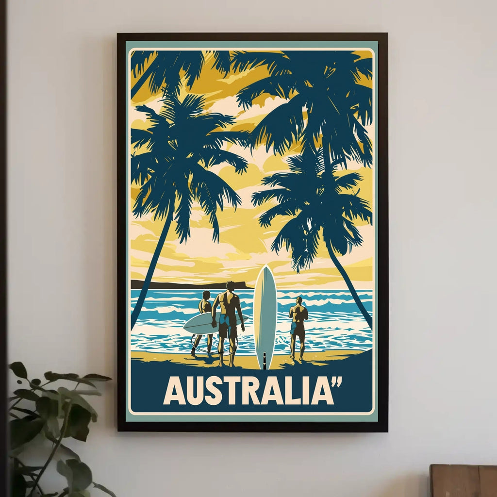 Capture the laid-back spirit of Australia with the Idyllic Vintage Beach Scene with Surfboards Travel Poster by PosterGoat. This retro-inspired print blends warm golden skies, deep teal palm silhouettes and a classic surf tableau—three surfers and their boards framed against rolling ocean waves—evoking timeless summer vibes and nostalgic surf culture for your home or office.