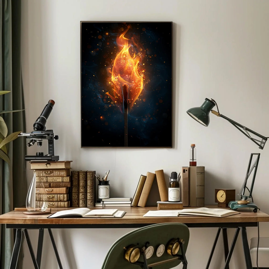 Ignite Your Space: Surreal Fire Art Poster invites you to immerse yourself in the captivating allure of fire. This poster presents a single matchstick ignited in a blaze of vibrant, swirling flames — a photorealistic yet surreal depiction that captures the dynamic intensity of fire. Rich orange and yellow hues radiate sparks and glowing particles against a contrasting blue and black background, adding depth, warmth, and drama to the composition. Bold and dramatic, this piece embodies ignition, energy, and transformation — a striking addition for anyone seeking power and unpredictability in their space.