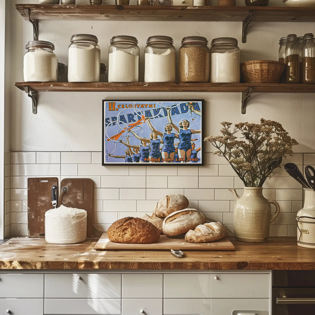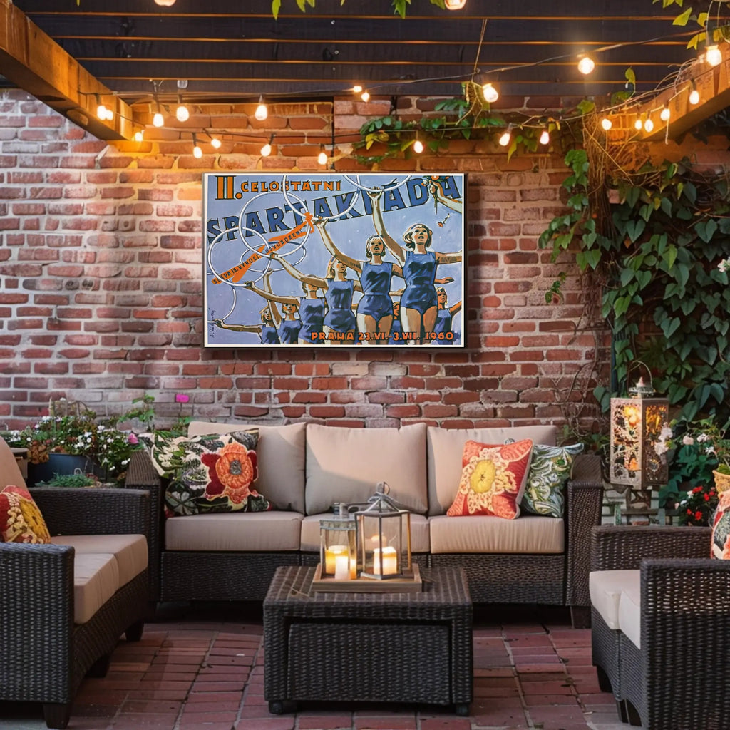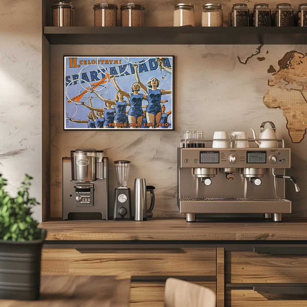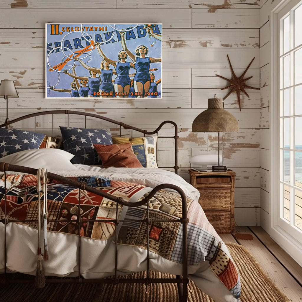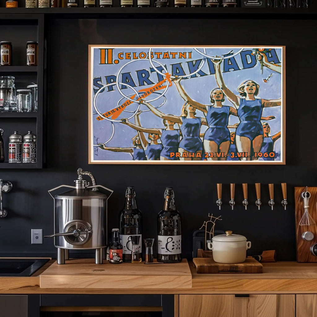 II. National Spartakiad 1960 Poster from PosterGoat brings a bold slice of mid-century athletic pageantry to your walls. This vintage-style art print features synchronized gymnasts reaching upward with rhythmic hoops, striking retro typography and a striking Prague date banner — a dynamic focal point for any room in need of history and movement.