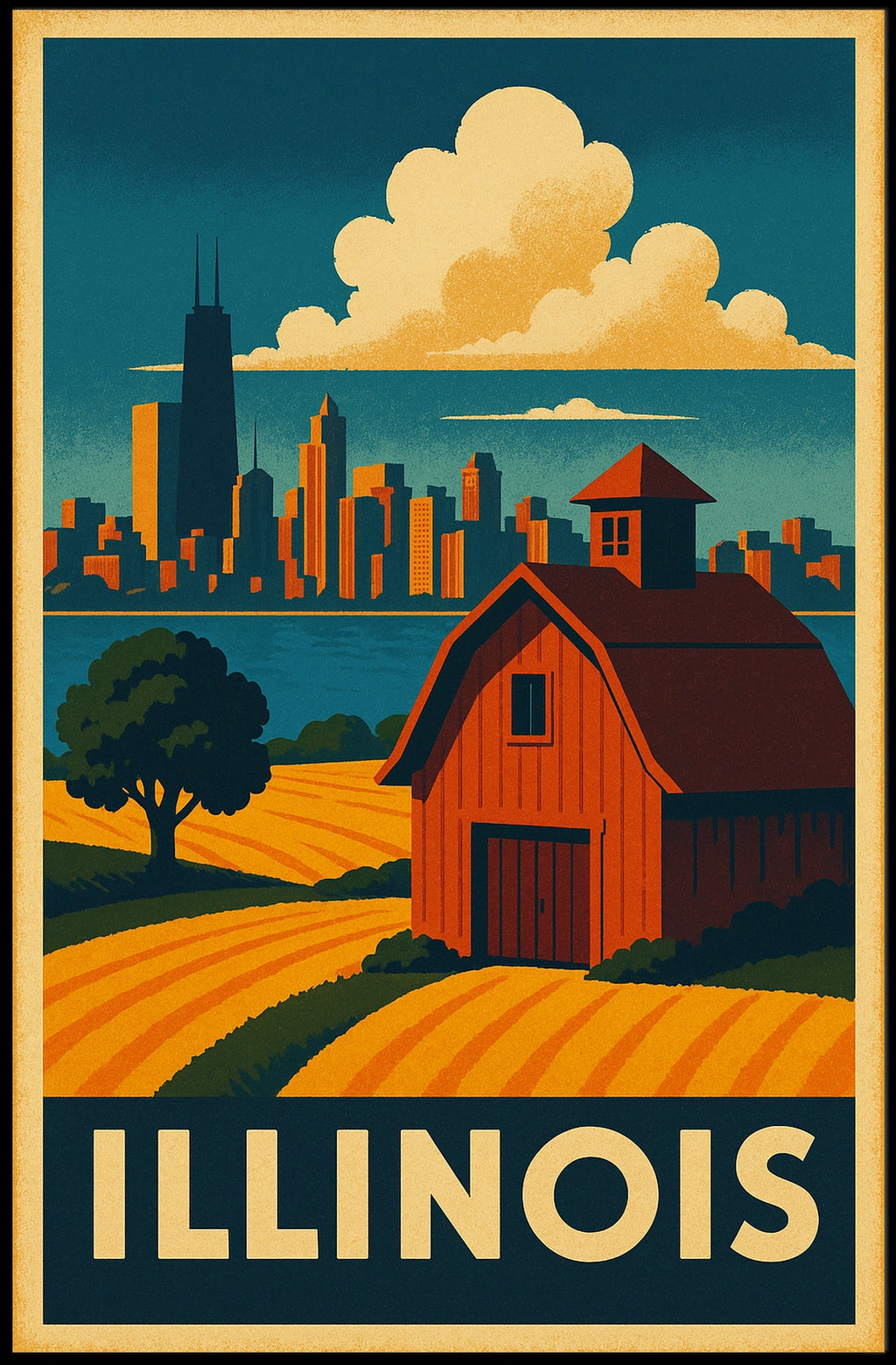 - Detailed design highlighting iconic Illinois landscapes—from rolling prairies and winding rivers to city skylines and rural vistas