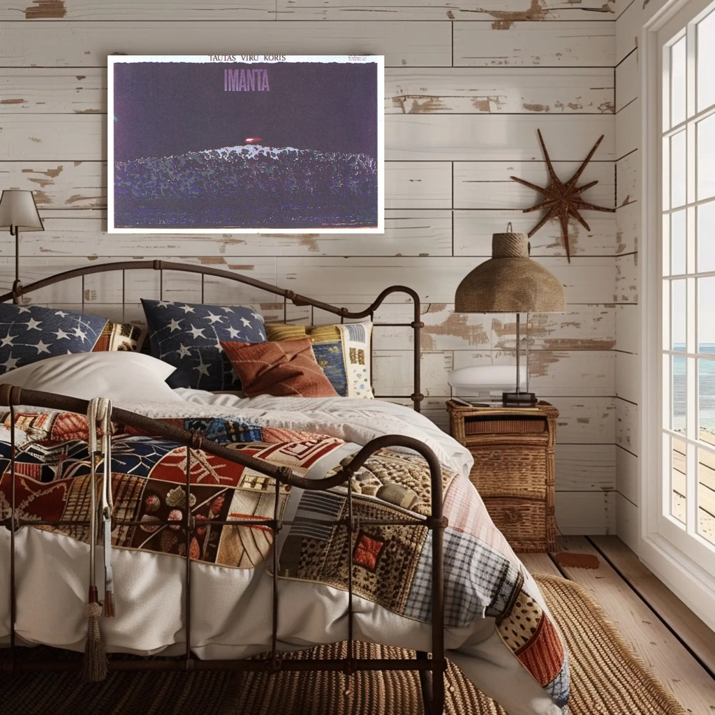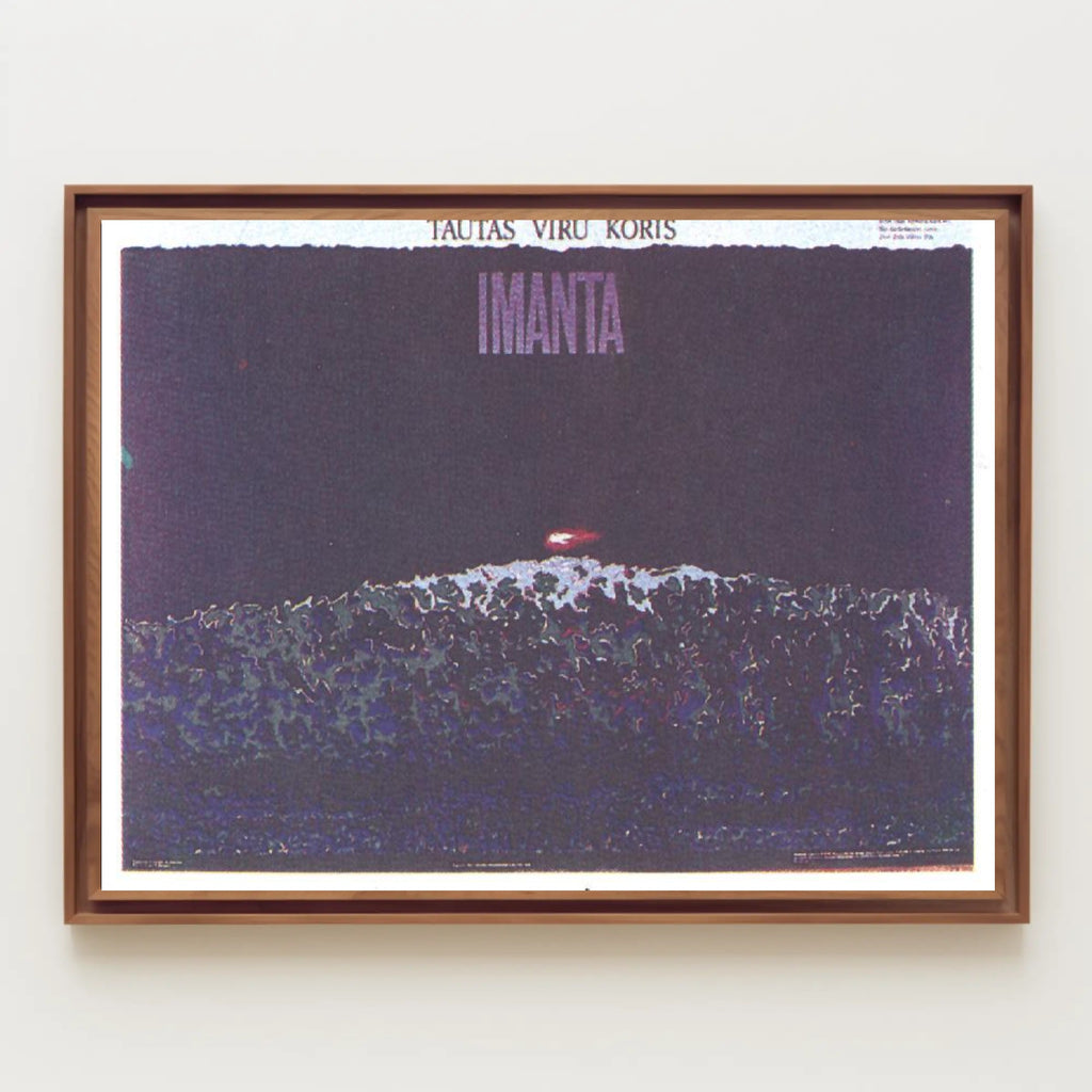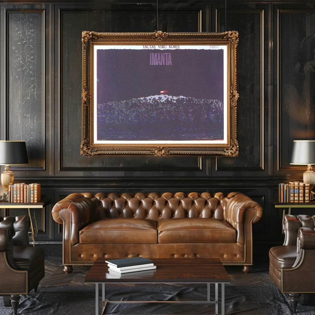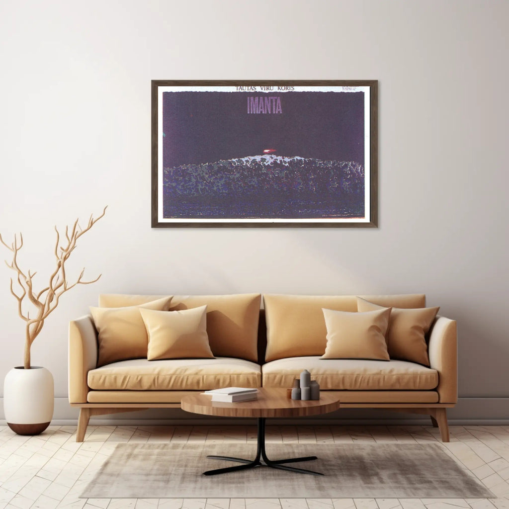 Why it works: The deep violet and indigo palette creates a moody, sophisticated atmosphere, while the subtle grain and layered textures give the print an authentic, gallery-ready feel. Bold typography at the top reading "IMANTA" anchors the composition and makes a strong statement on any wall.