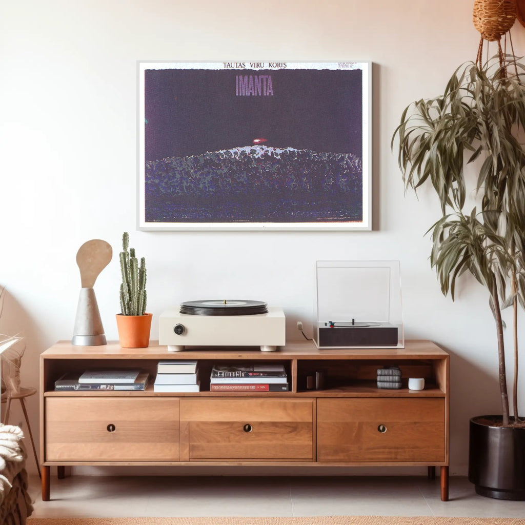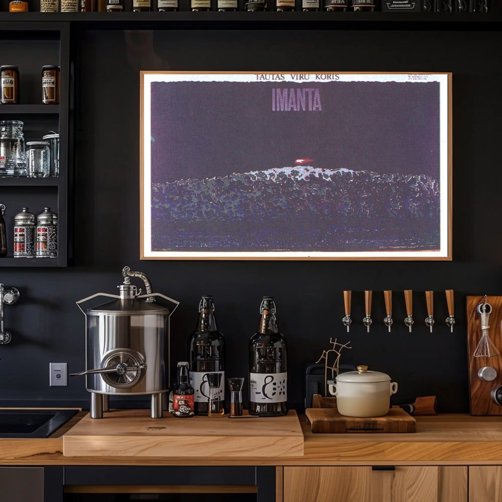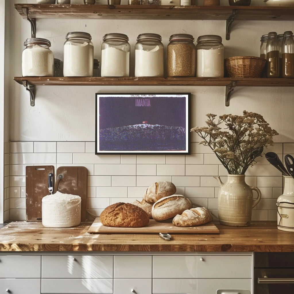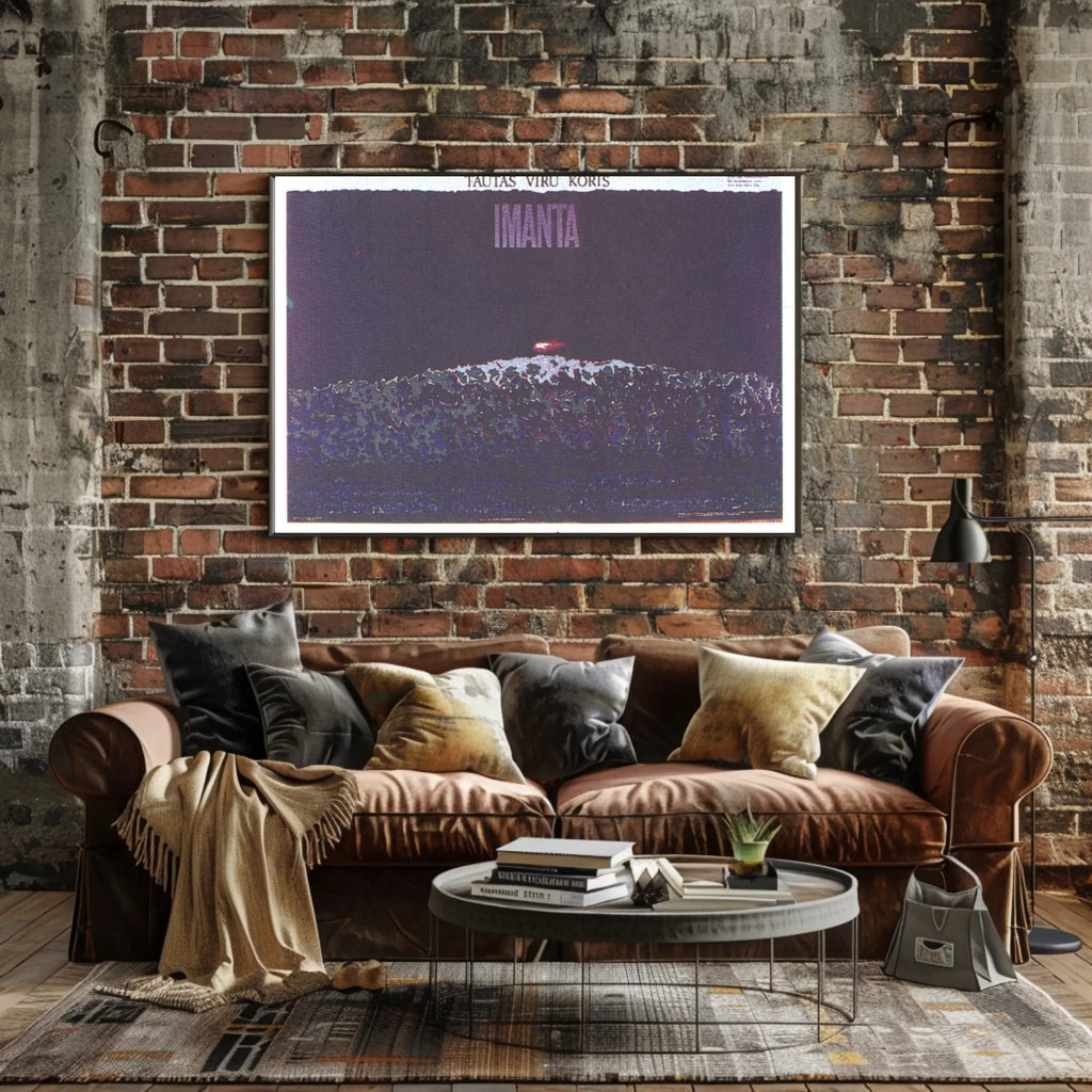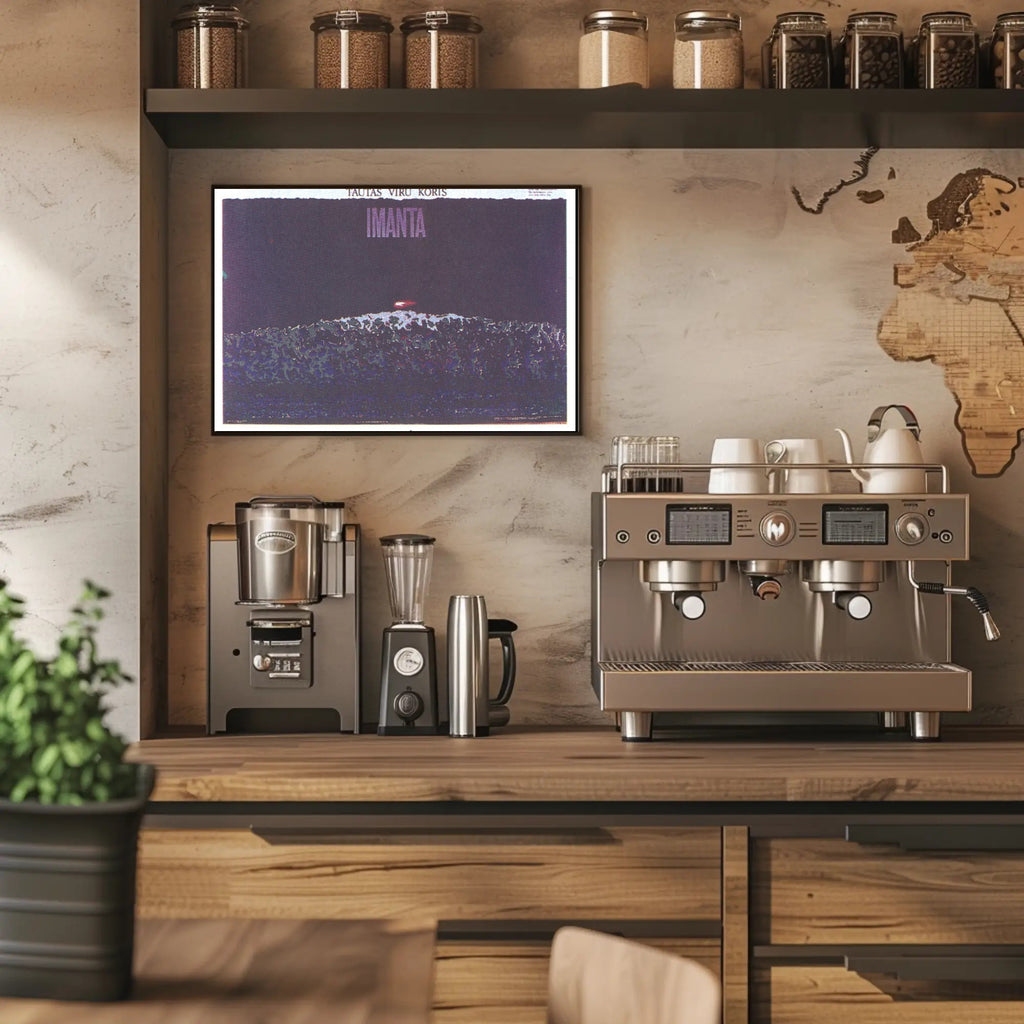 Why it works: The deep violet and indigo palette creates a moody, sophisticated atmosphere, while the subtle grain and layered textures give the print an authentic, gallery-ready feel. Bold typography at the top reading "IMANTA" anchors the composition and makes a strong statement on any wall.