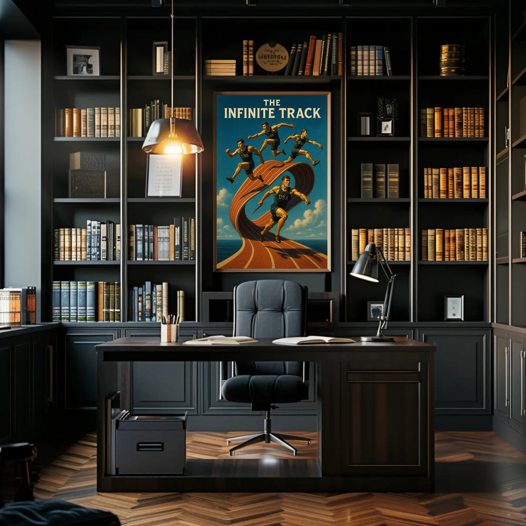 Experience the relentless pursuit of athletic excellence with this dynamic poster. The Infinite Track Jim Thorpe Poster features a USA runner on an endless looped track, capturing motion, perseverance, and the power of possibility. Its vibrant colors and surreal design spark energy in any space, making it a standout piece for gyms, studios, or living areas where motivation matters.