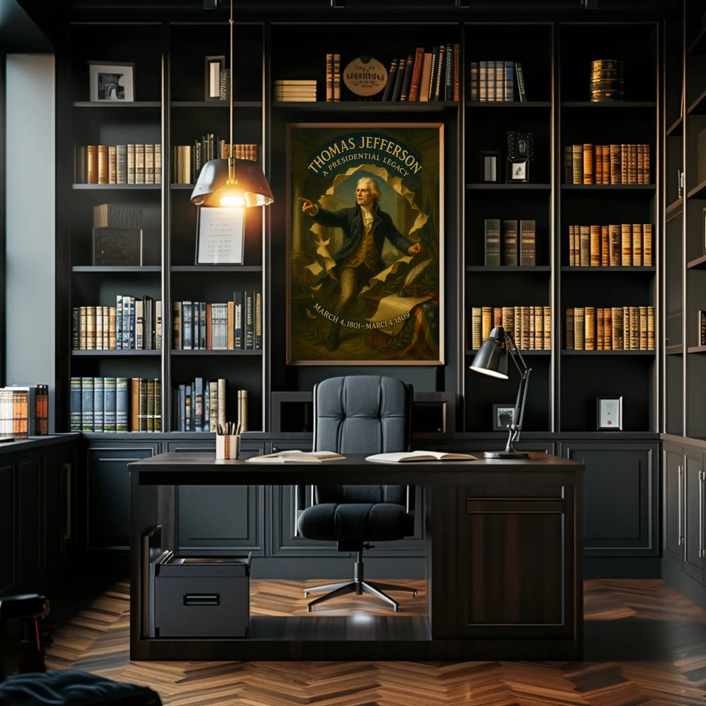 Experience the grandeur of American history with this stunning poster, portraying an influential leader from the early 19th century. The artwork captures the timeless elegance of classical portraiture with a vintage touch. The central figure exudes authority, depicted in period-appropriate attire, surrounded by powerful symbols like the American flag, a quill, and parchment. These elements highlight governance and the founding principles of the nation. The grand architectural columns in the backdrop enhance the historical gravitas. This bold, patriotic piece celebrates leadership and legacy, perfect for those who appreciate historical significance and political heritage.