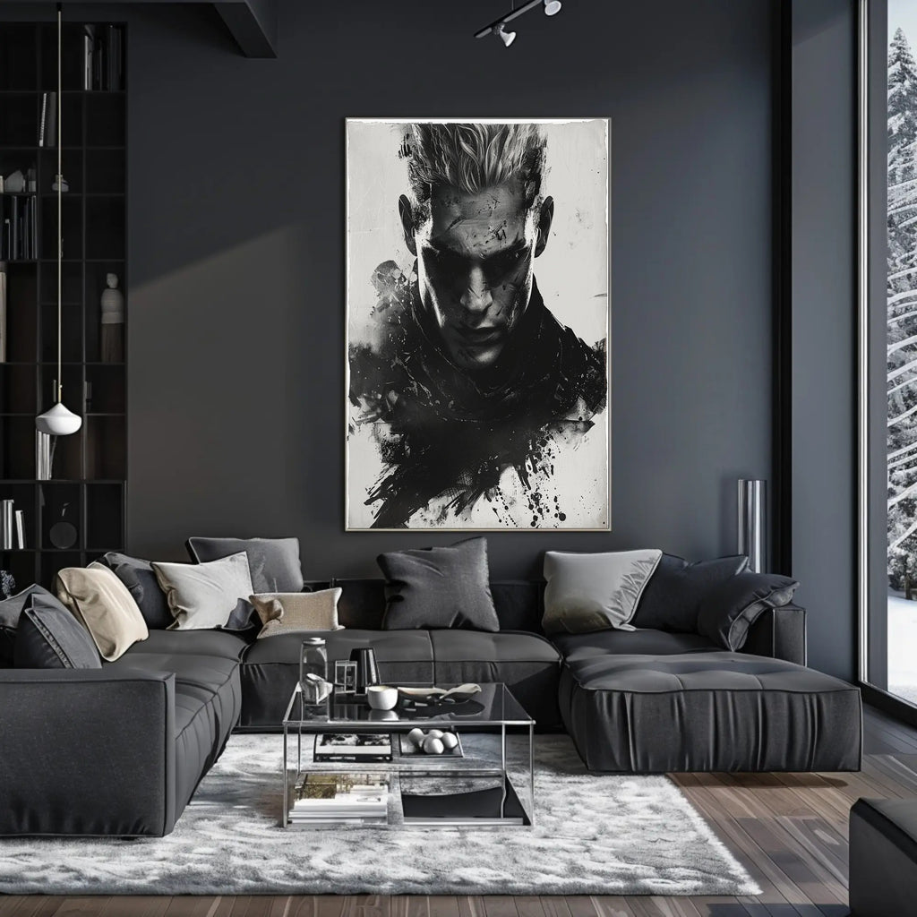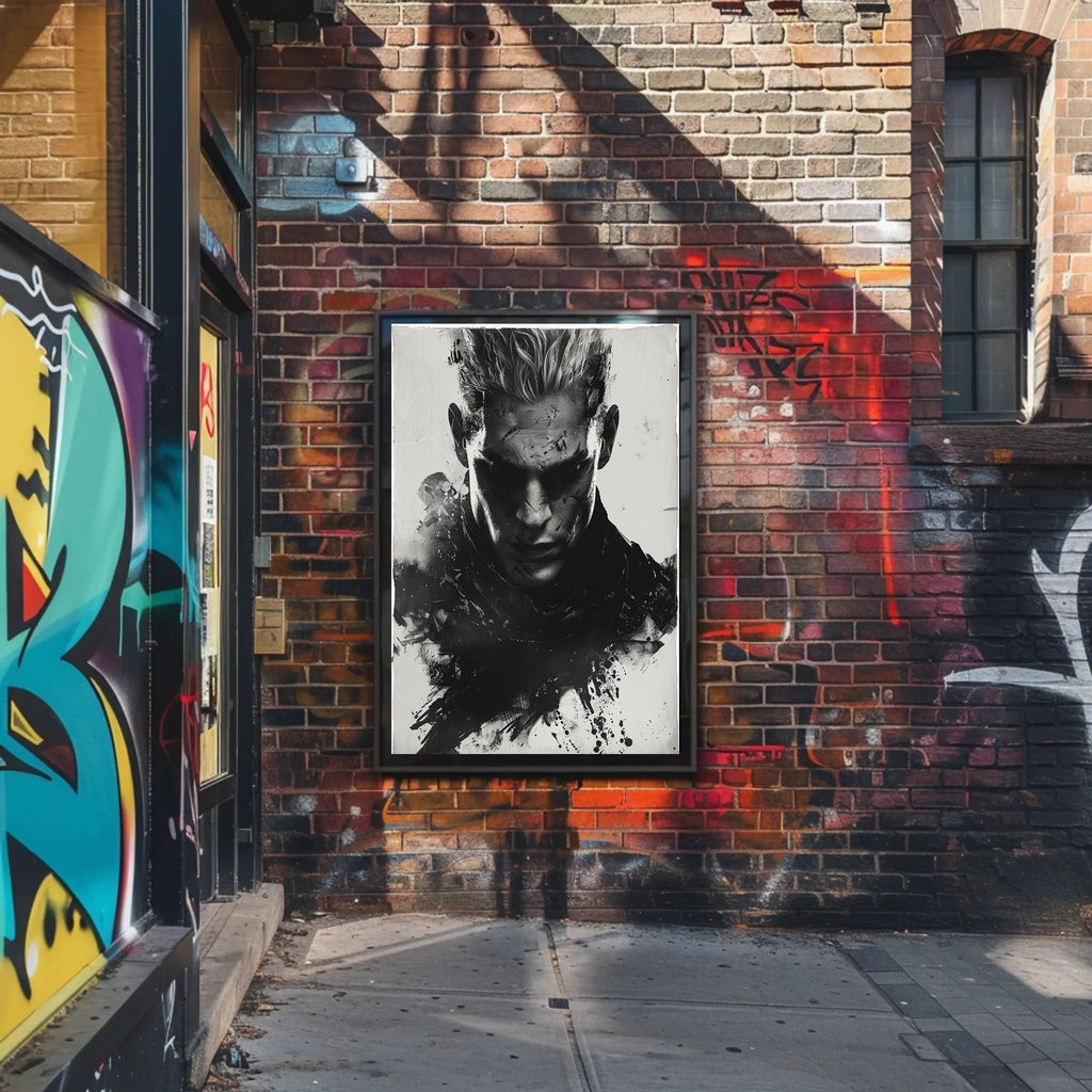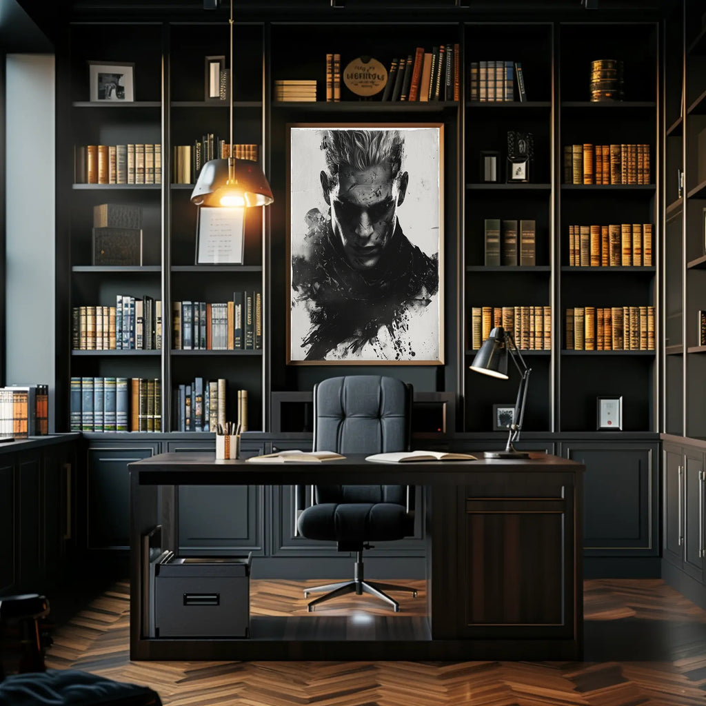 Intense Black and White Brooding Character Poster from PosterGoat delivers a powerful monochrome statement piece that transforms any wall into a dramatic focal point. This brooding portrait captures a mysterious character with slicked-back hair, deep shadowed eyes and painterly ink splatters that blur the line between photographic realism and abstract grunge — perfect for modern decor, lofts, studios, and galleries.