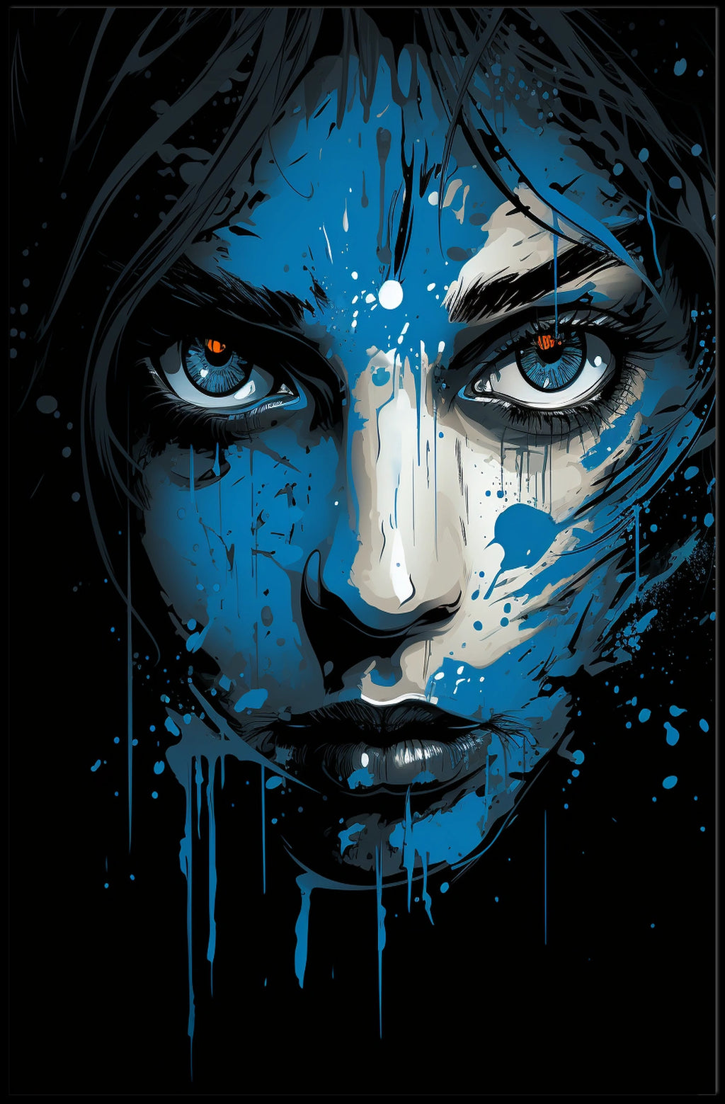 Vivid blue paint splashes bring the artwork to life, creating a dynamic and edgy visual. The fusion of graffiti elements and graphic illustration results in a bold, expressive style that stands out in modern interiors and art collections alike.