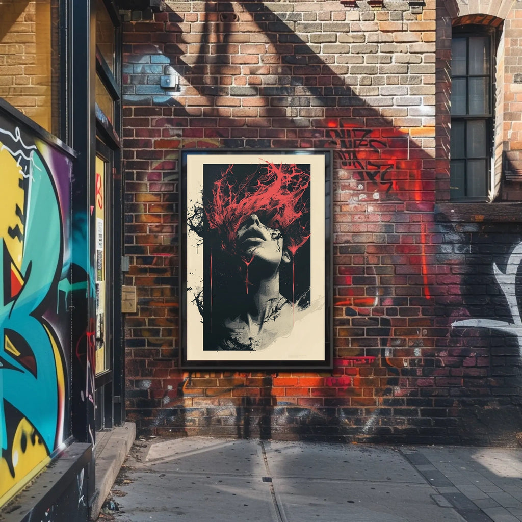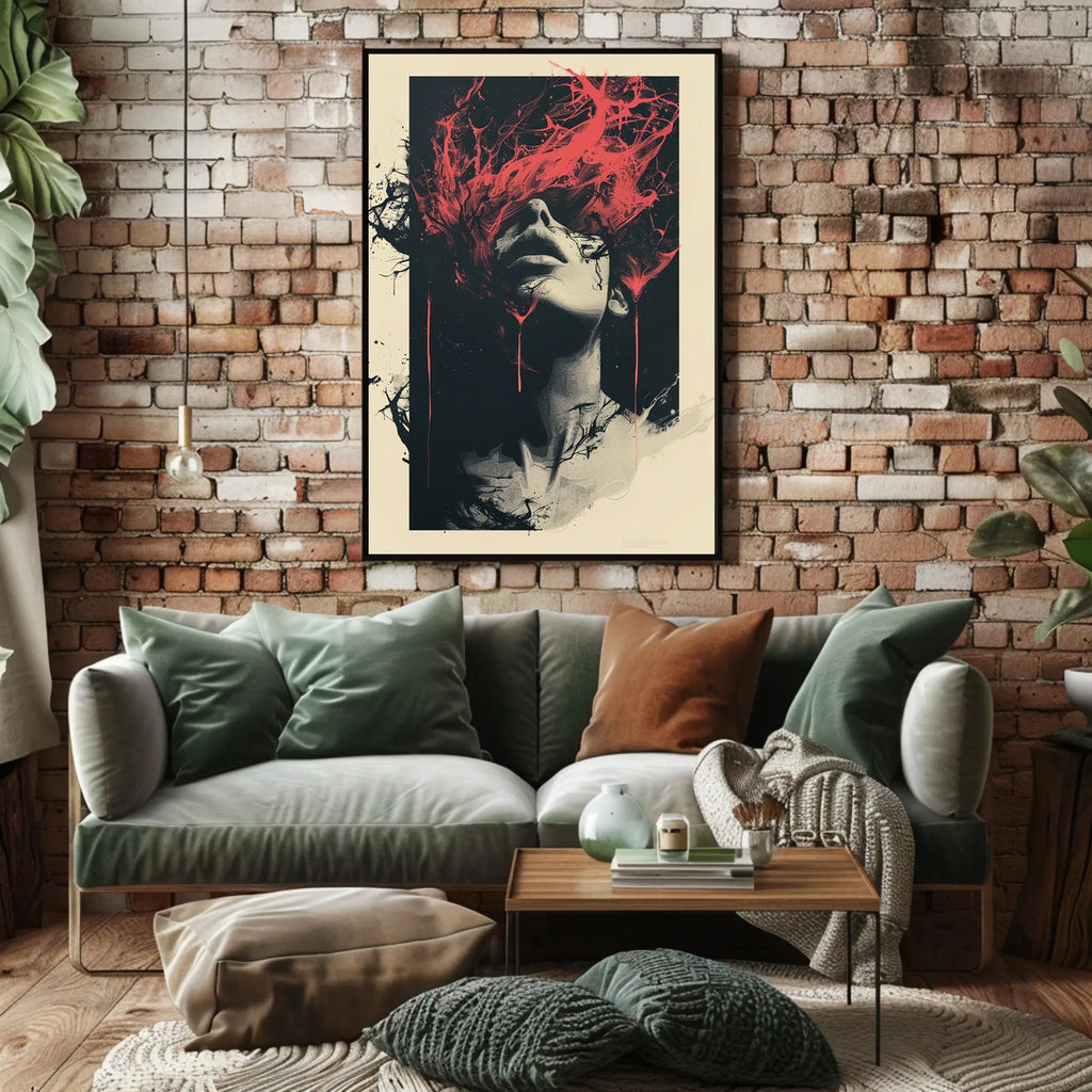 Experience the captivating allure of modern surrealism with this striking poster. Featuring a grayscale human face oriented upwards, the design is dramatically contrasted by a vibrant red cascade resembling fluid or fire enveloping the face's upper portion. This dynamic splash of color creates a sense of motion and emotion, set against a dark background that enhances the visual impact. The blend of photorealistic and abstract elements evokes themes of transformation and awakening, making it a bold addition to any space. Perfect for art enthusiasts seeking emotional expression and visual drama.