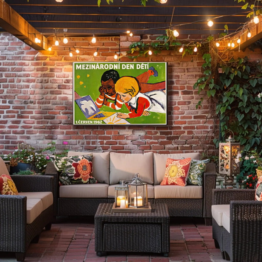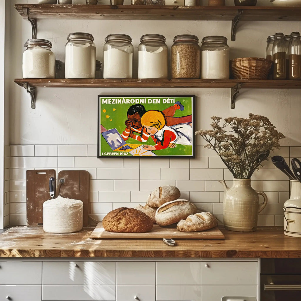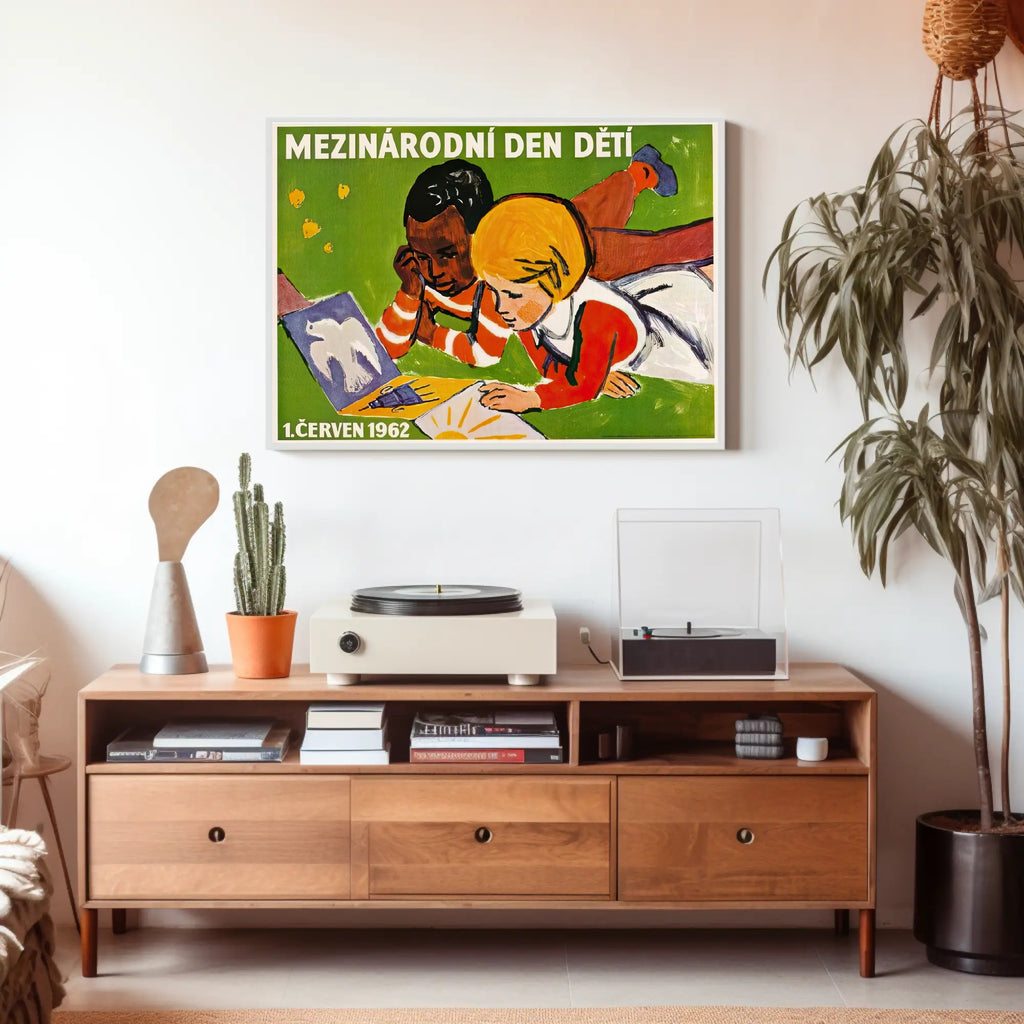 Celebrate a vintage moment with the International Children's Day 1962 Poster from PosterGoat — a vibrant, museum-style art print perfect for home decor and collectors of historical posters. This eye-catching poster features two children reading together against a striking green field, bold white Czech lettering at the top, and the date "1. Červen 1962" anchoring the composition. Its hand-painted look, playful brushstrokes and warm palette make it an instant focal point for living rooms, nurseries, cafes or gallery walls.