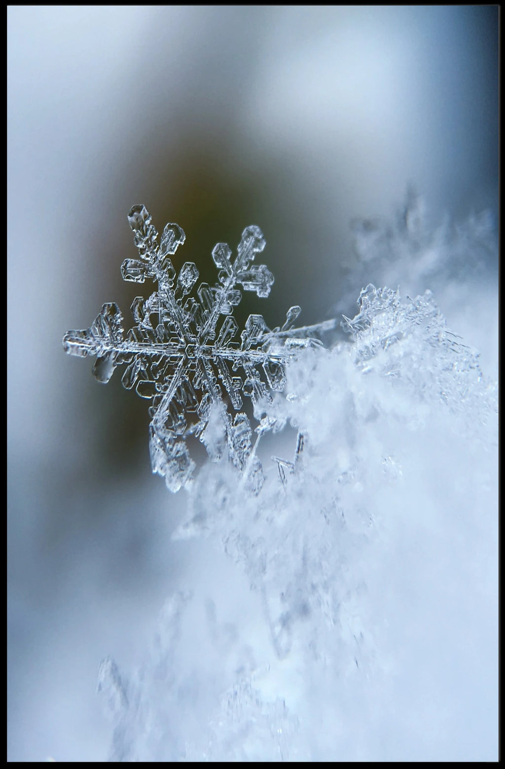 Intricate Snowflake Winter Scene Photorealistic Artistic Poster celebrates the breathtaking beauty of winter in a photorealistic close-up of a singular snowflake. The intricate lattice structure of this ice crystal is captured in exquisite detail, emphasizing the delicate and fragile nature of these natural wonders. Set against a softly blurred background, the snowflake appears almost ethereal, standing out as the focal point in this serene scene. The natural lighting enhances the clarity and depth of the image, creating a peaceful and calming ambience. Perfect for those who appreciate the purity and intricate beauty of nature.