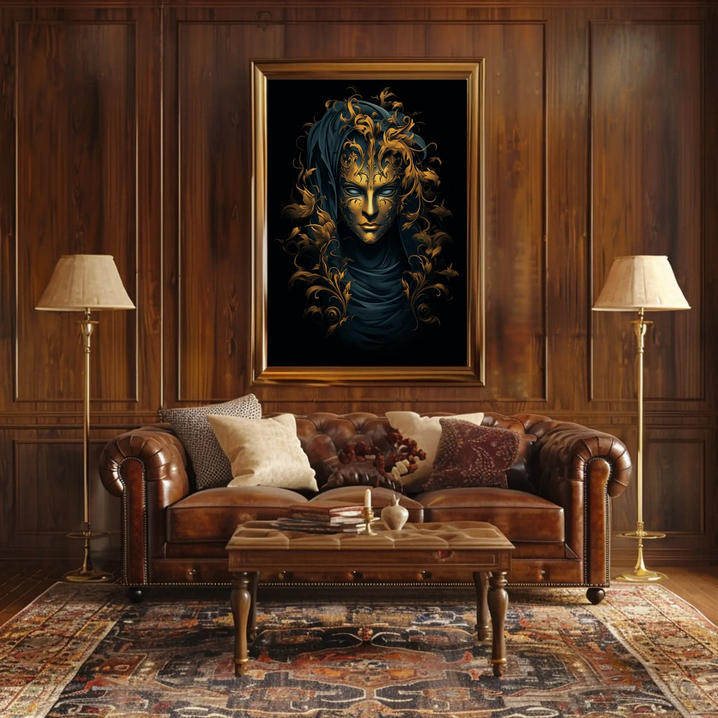 This captivating poster features a mask with an exquisite floral motif that exudes mystery and luxury. Set against a dark backdrop, the mask is embellished with swirling golden leaves and tendrils, enhancing its opulent aura. The piercing, glowing blue eyes inject a mystical touch, inviting viewers into a world of hidden identities and enigmatic elegance. The artwork seamlessly blends modern digital illustration with baroque influences, showcasing elaborate details and dramatic contrasts. Perfect for those who appreciate fantasy art or baroque-inspired design, this piece adds a touch of sophistication and intrigue to any space.