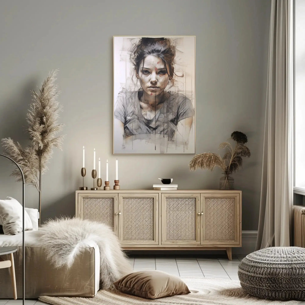 Why you’ll love it: The portrait’s layered textures and minimal color palette create a timeless piece that enhances a curated interior without overpowering it. Its evocative presence sparks conversation and adds emotional depth to gallery walls or standalone displays.