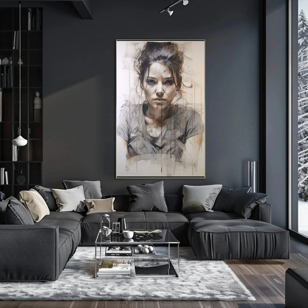 Introspective Young Woman Artistic Portrait Poster by PosterGoat brings a hauntingly beautiful focal point to any room — a finely rendered, sketch-like portrait that captures quiet emotion and thoughtful depth. This minimalist artwork pairs expressive charcoal strokes with subtle washes of muted color to create a modern, contemplative statement piece perfect for home or office wall art.