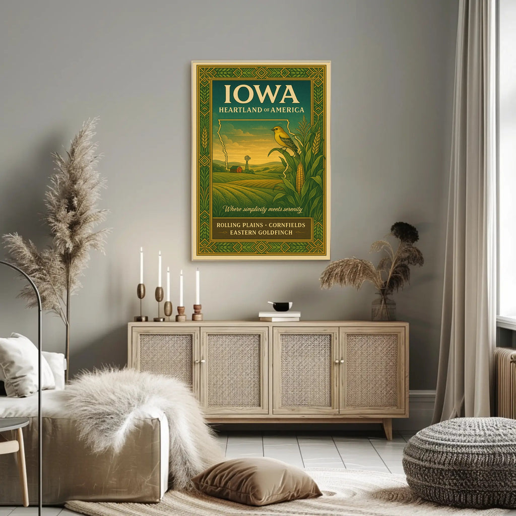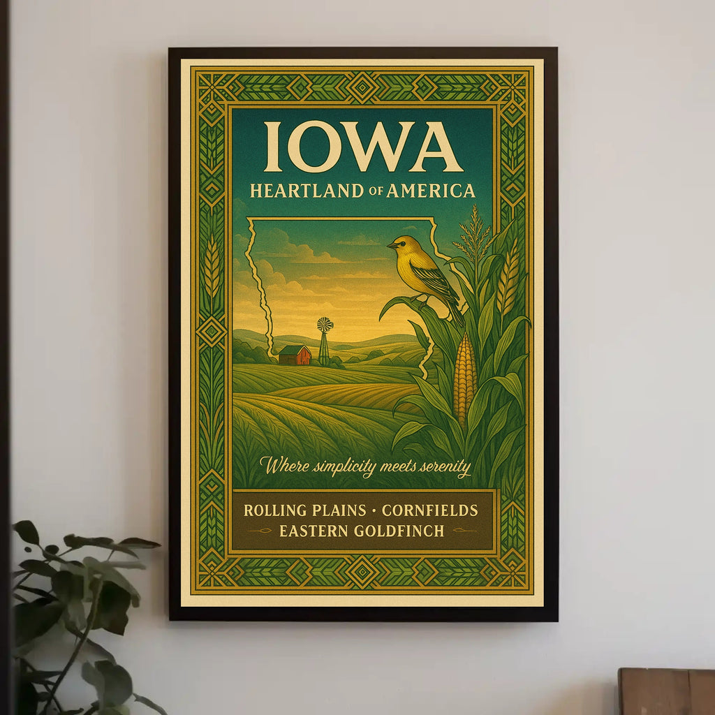 Iowa Heartland Of America Poster from PosterGoat captures the quiet beauty of the Midwest in a vintage-inspired travel poster designed for lovers of scenic wall art and minimalist decor.