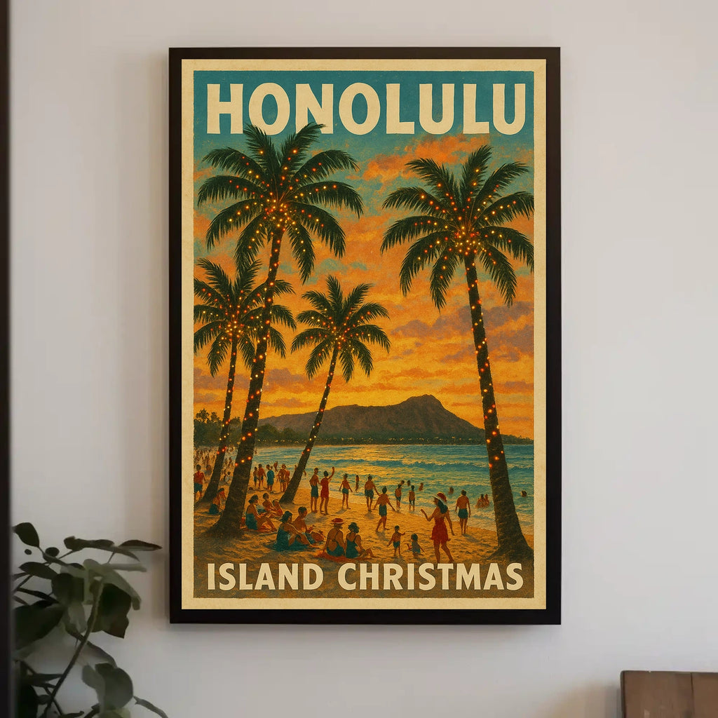Perfect for Hawaii lovers, this Honolulu-inspired poster doubles as a scenic wall art piece and a thoughtful gift or souvenir for travelers and decor enthusiasts. It blends tropical warmth with festive spirit to fit any home, classroom, or office.