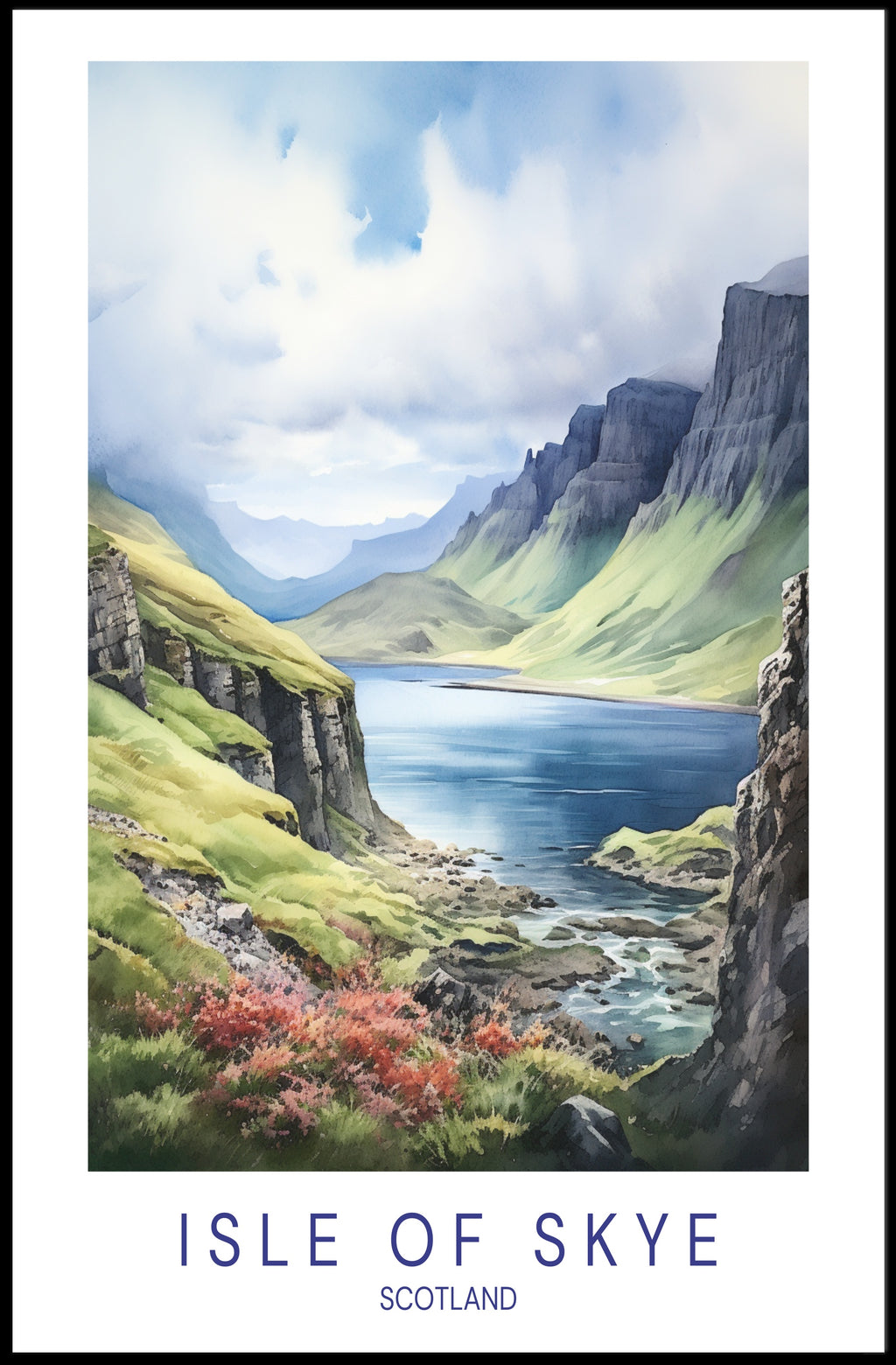 Hang the Isle of Skye Tranquility Travel Poster to transform your wall into a window on the Scottish Highlands.