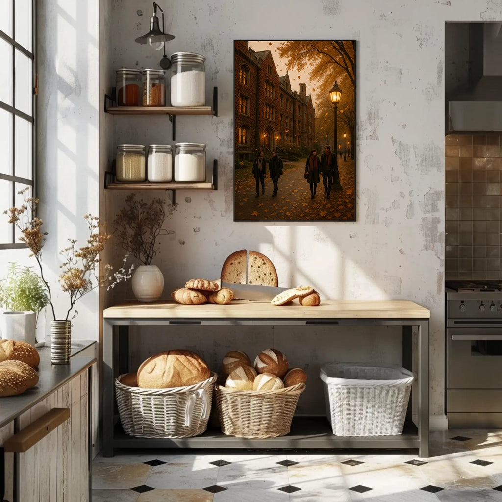 Experience the serene beauty of academia with this photorealistic poster, capturing an ivy-clad university building set against the backdrop of a crisp autumn day. The scene evokes the charm of prestigious Ivy League campuses, with four warmly dressed individuals strolling down a leaf-strewn path. The warm glow of street lamps enhances the nostalgic and romantic essence of fall, creating an inviting atmosphere. This artwork is perfect for those who appreciate intellectual tradition and the picturesque allure of autumn, making it an ideal addition to any study, office, or living space.