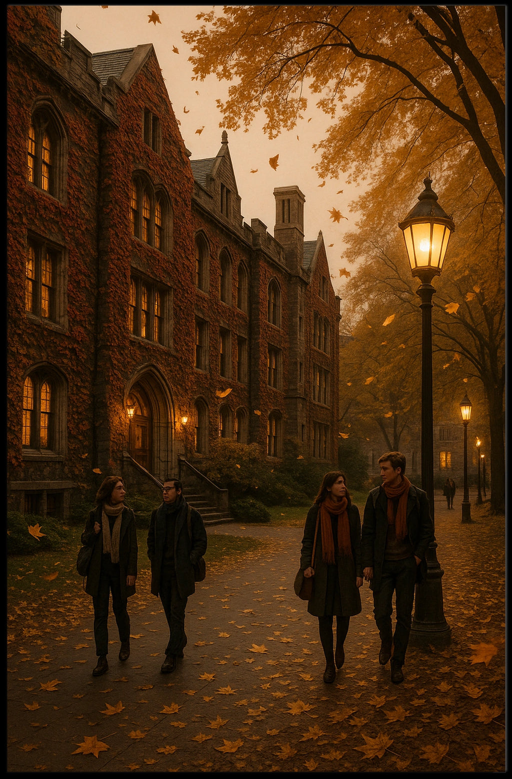 - Detailed design highlighting the ivy-clad university building against a crisp autumn day—complete with four warmly dressed individuals strolling along a leaf-strewn path and the soft glow of street lamps