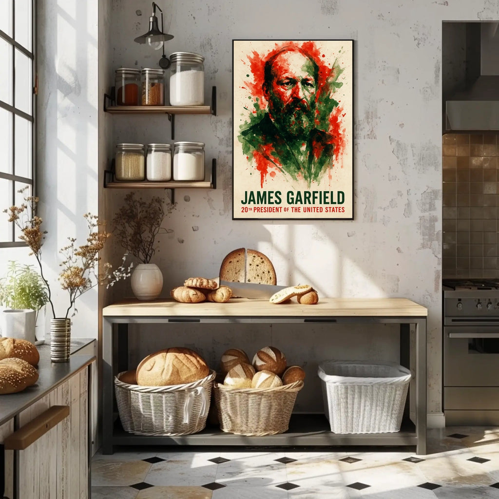 Bring a splash of presidential history into your space with this modern interpretation of a James Garfield portrait. The abstract watercolor rendering honors the 20th President of the United States while offering a contemporary focal point for home office decor, living rooms, or classrooms. Perfect for history lovers, students, and art enthusiasts alike, this poster invites conversation and appreciation for both historical significance and artistic merit.