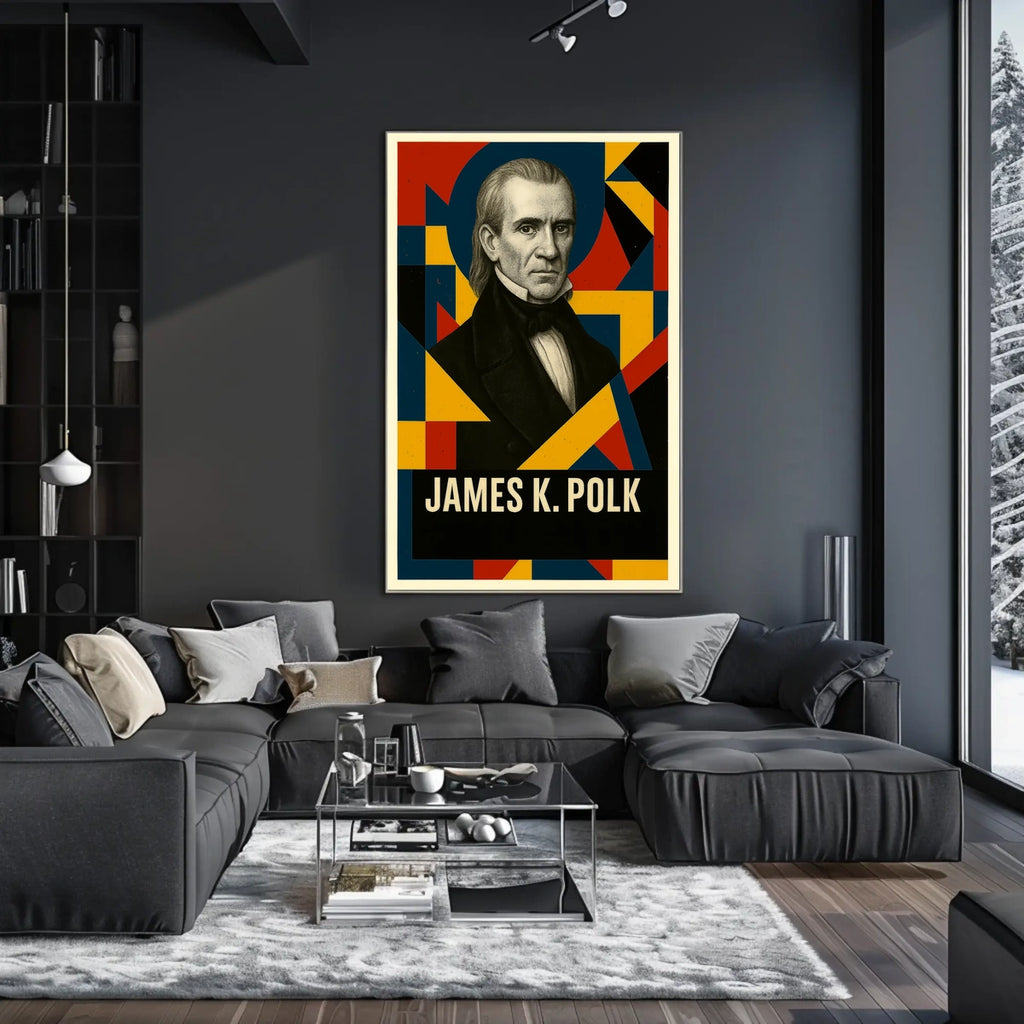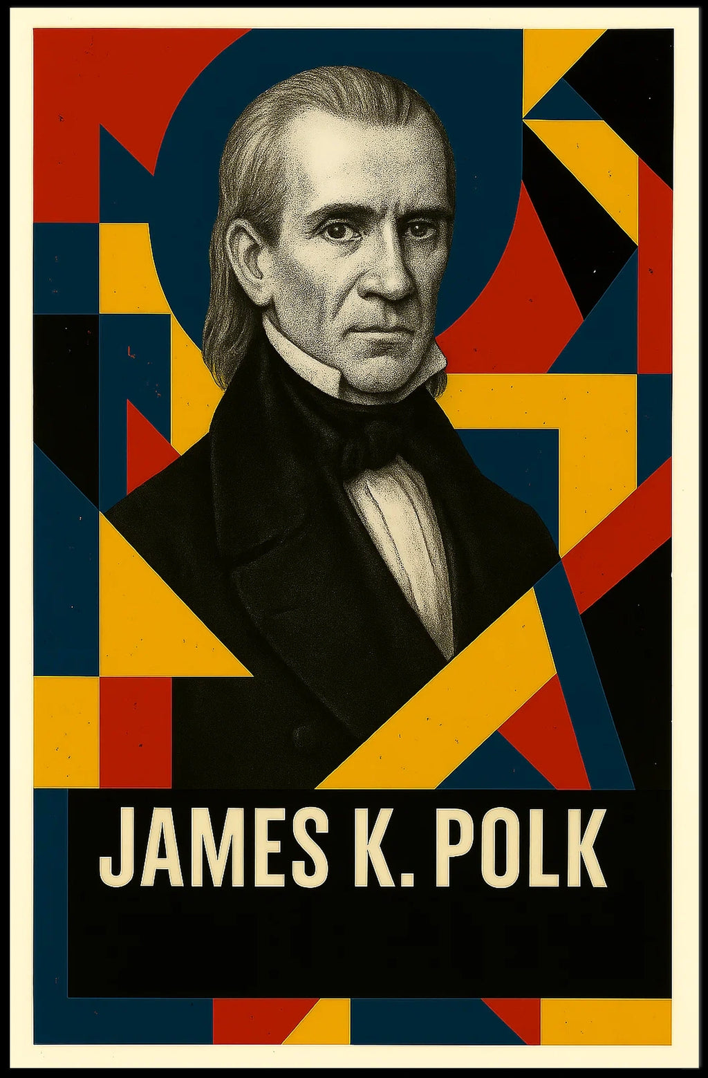 James K. Polk 11th President abstract pop poster designed for wall display. It presents Polk in a modern, graphic style suitable for homes and offices.