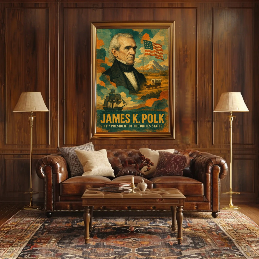 Bring a pivotal chapter of American history into your space with the James K. Polk 11th President of the United States Layered Digital Collage Poster. Designed for history lovers, educators, and stylish interiors, this poster blends portraiture with a dynamic collage texture to create a distinctive wall piece.